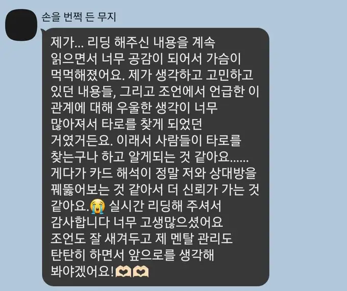 안녕하세요, 신청해 주셔서 감사합니다만 저는 당분간 리딩을 진행하지 않을 예정입니다. 슬롯 닫아두는 것을 잊어서 혼란을 드린 점 죄송합니다. 좋은 하루 되십시오. 버섯의 타로 커미션. Ms.Mush. 타로심리상담사 1급 보유