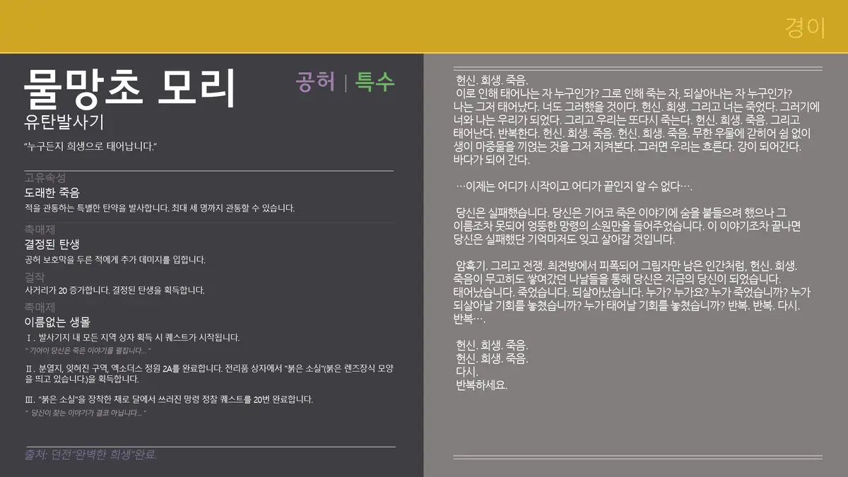 *출처=획득 방법(월드 드랍, 던전, 레이드, 갬빗, 시련의 장, 황혼전, 오시리스의 시험/etc...)