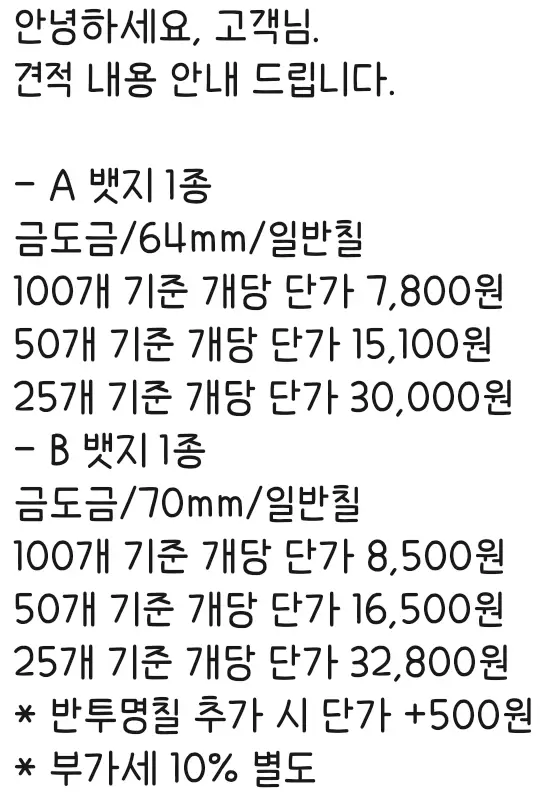 100개 기준 단가로 주문할 예정입니다.