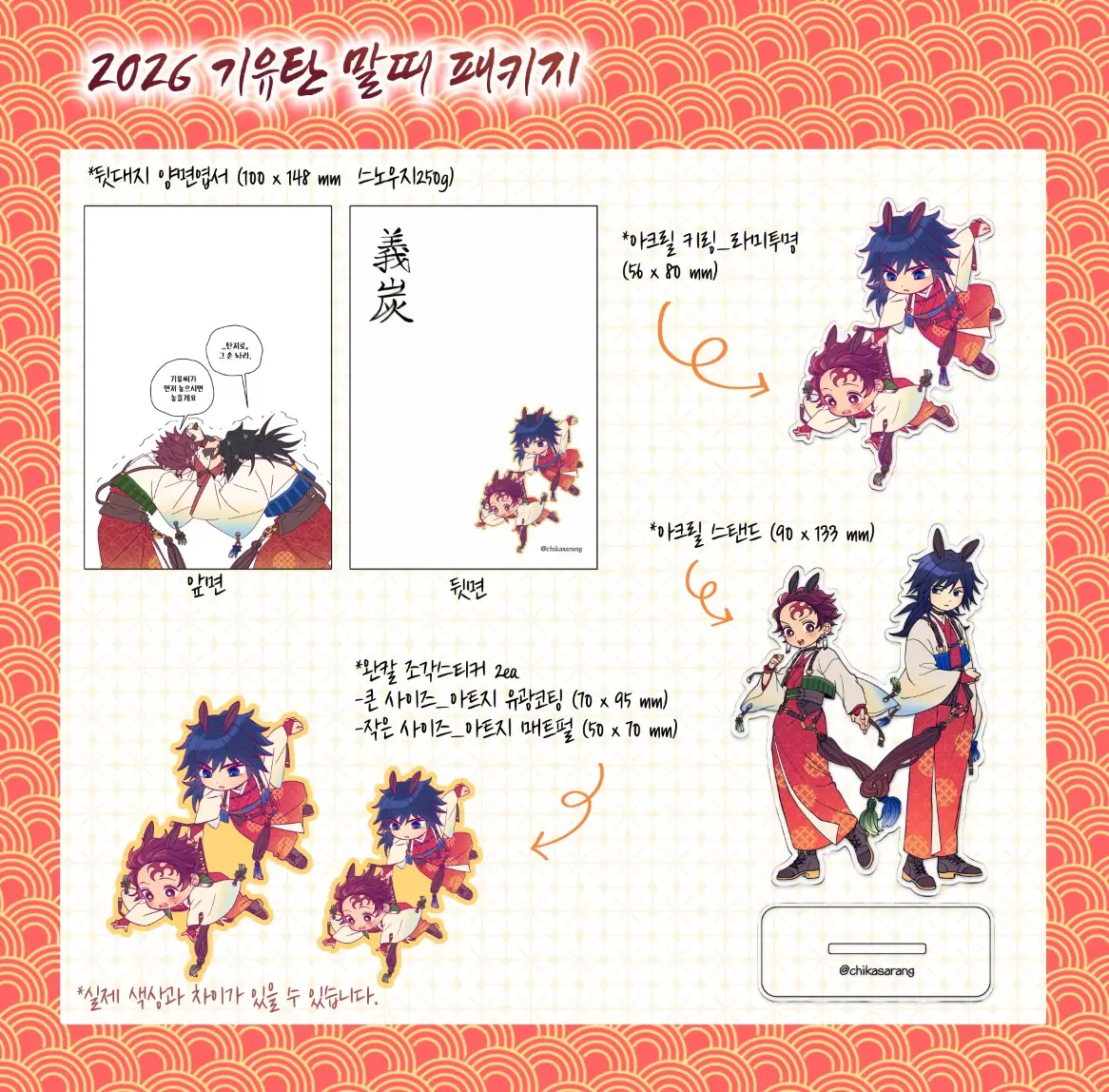 -배송은 4월 2일부터 일괄배송 진행 될 예정입니다만, 1인 포장 및 배송이라 시간상 지연될 수 있습니다. 윗치폼과 X(@chikasarang)로 배송관련 공지를 올릴 예정이니 확인 부탁드리겠습니다.