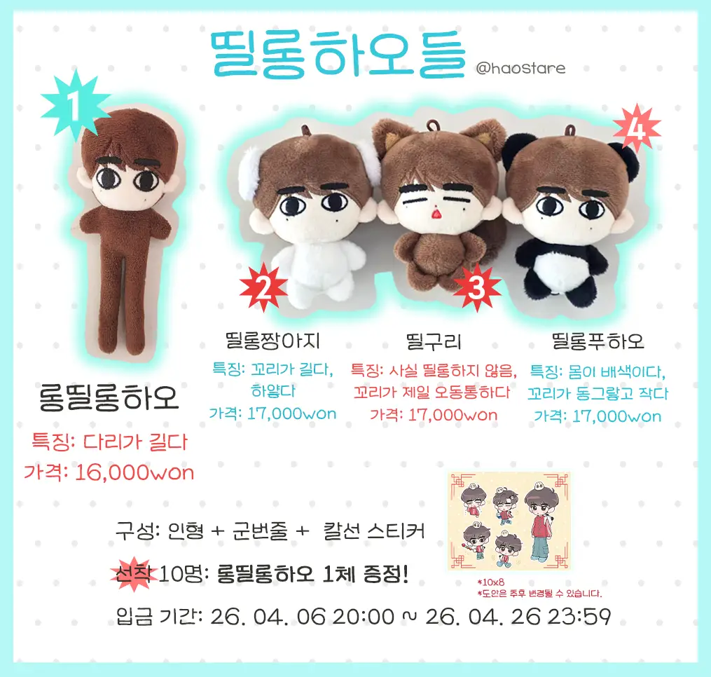 * 인형과 관련된 모든 공지와 진행사항은 트위터(@haostare)에서 확인할 수 있으며 그룹오더(G.O)진행은 트위터 DM 문의 부탁드립니다.