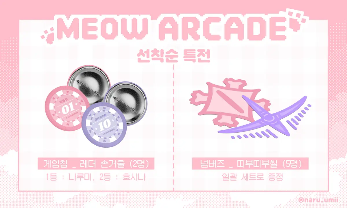 중복 제공 Xx (ex. 선착순 2등까지 게임칩 손거울 랜덤 증정 | 선착순 3등~7등의 경우, 띠부띠부씰 해당) = 총 선착순 7명에게 1번부터 차례로 제공