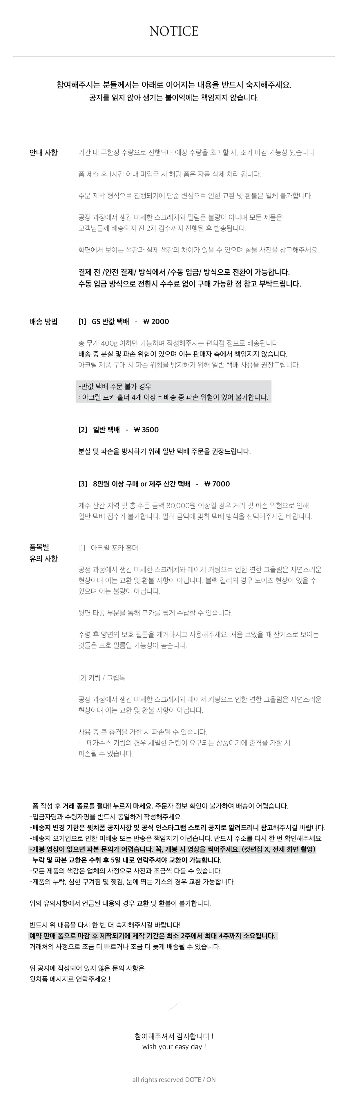 ★ 상세 페이지 내에 작성되어 있는 공지 사항을 숙지하지 못하신 경우 발생하는 사항은 판매자 측에서 책임질 수 없음을 다시 한 번 알려드립니다.