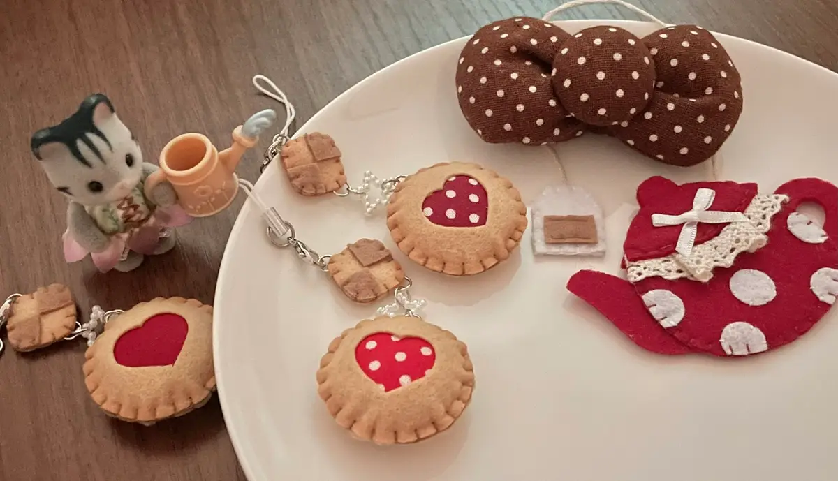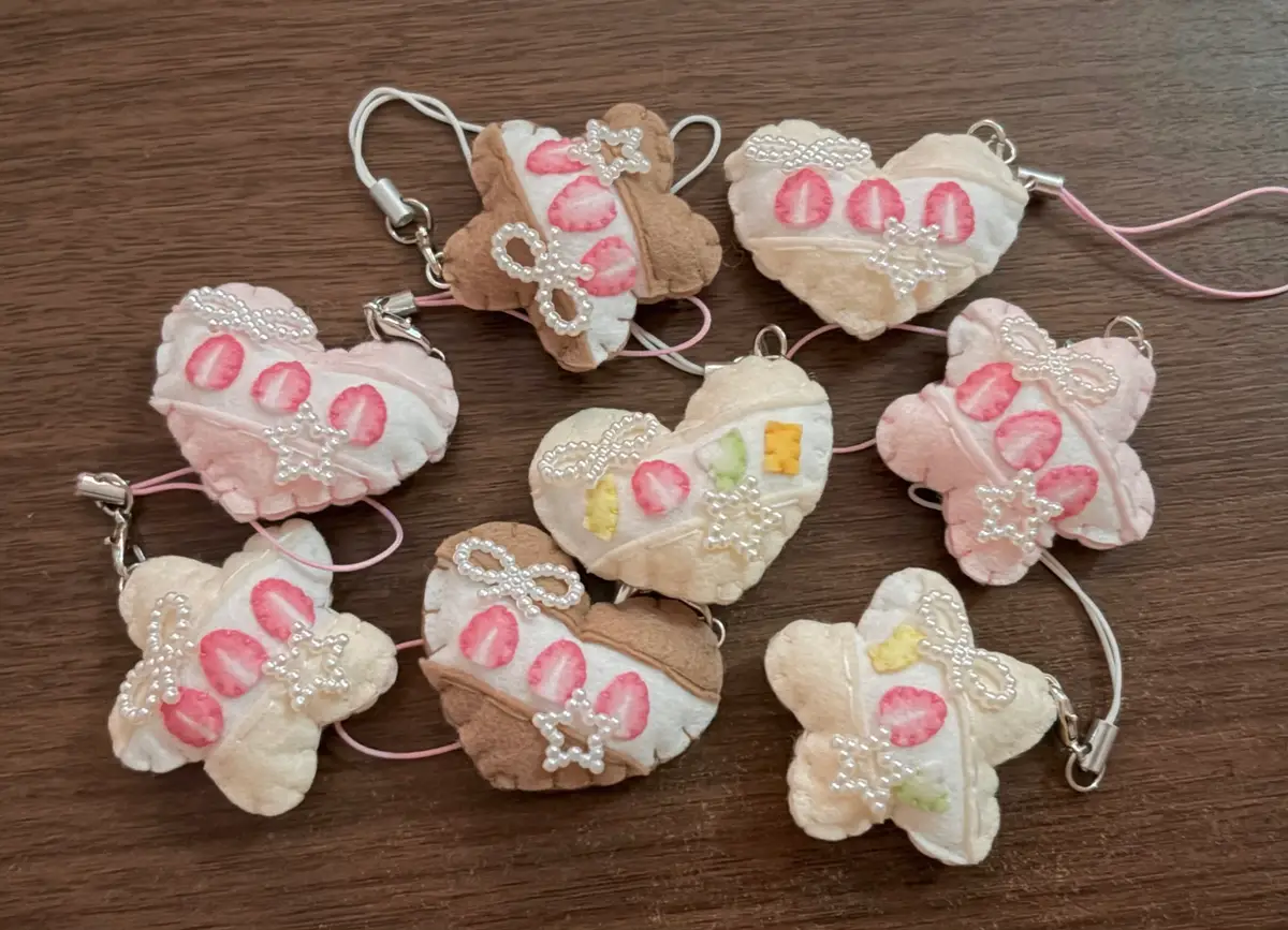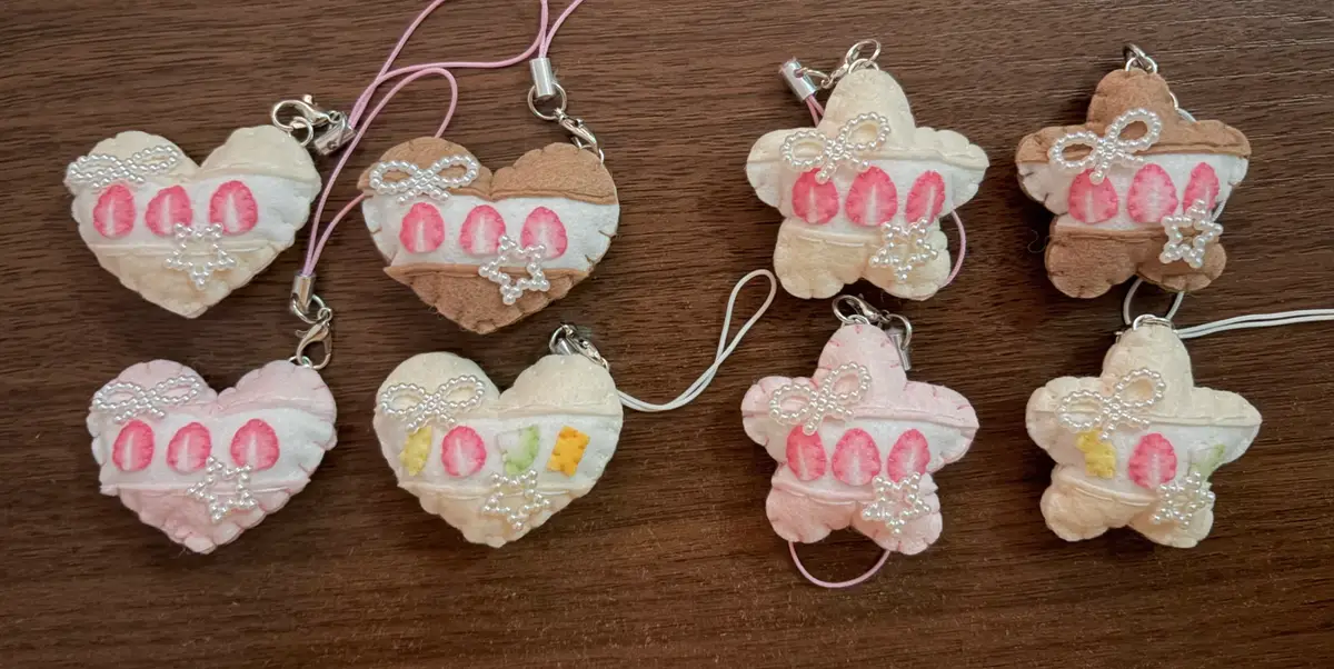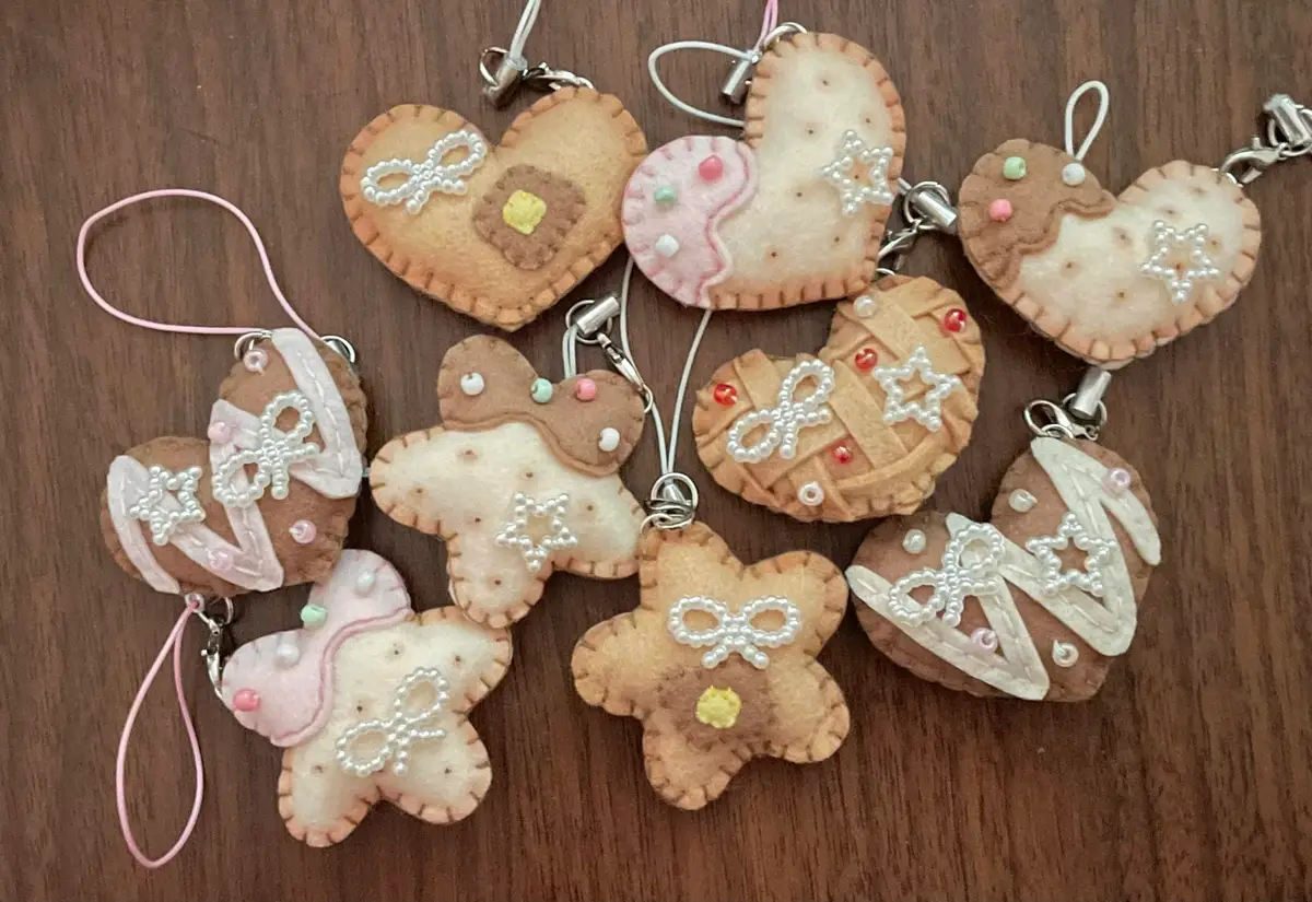 -주렁주렁 베이커리 키링입니다! 체크 무늬 버터쿠키와 원형 쿠키가 주렁주렁 달려있어서 귀여워요!! 딸기잼 부분 무늬는 랜덤으로 증정됩니다!