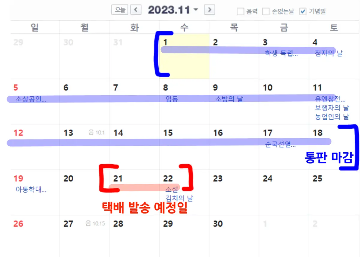 11월 21~22일 정도에 우체국 택배 or 준등기로 발송 예정입니다.