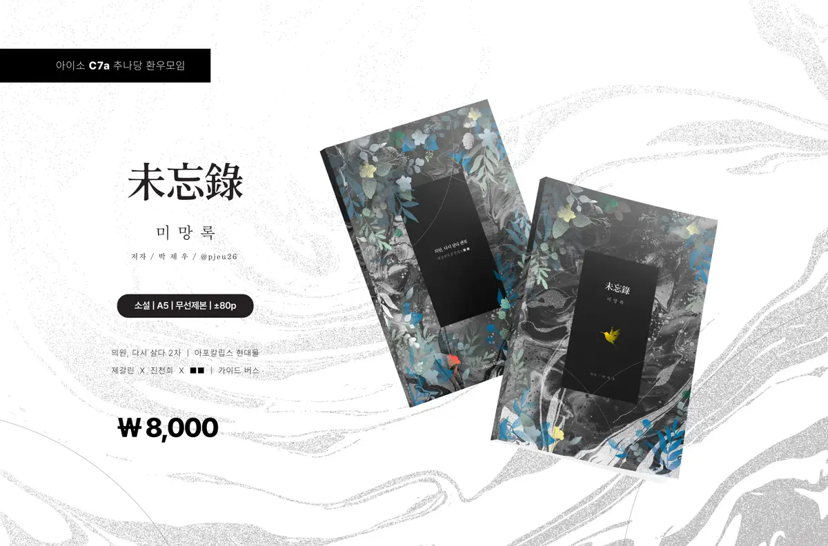- A5 | ±80(미정) | 무선제본 | 8,000원 (미정 사양 확정 후 트위터 및 샘플페이지 안내 예정 )