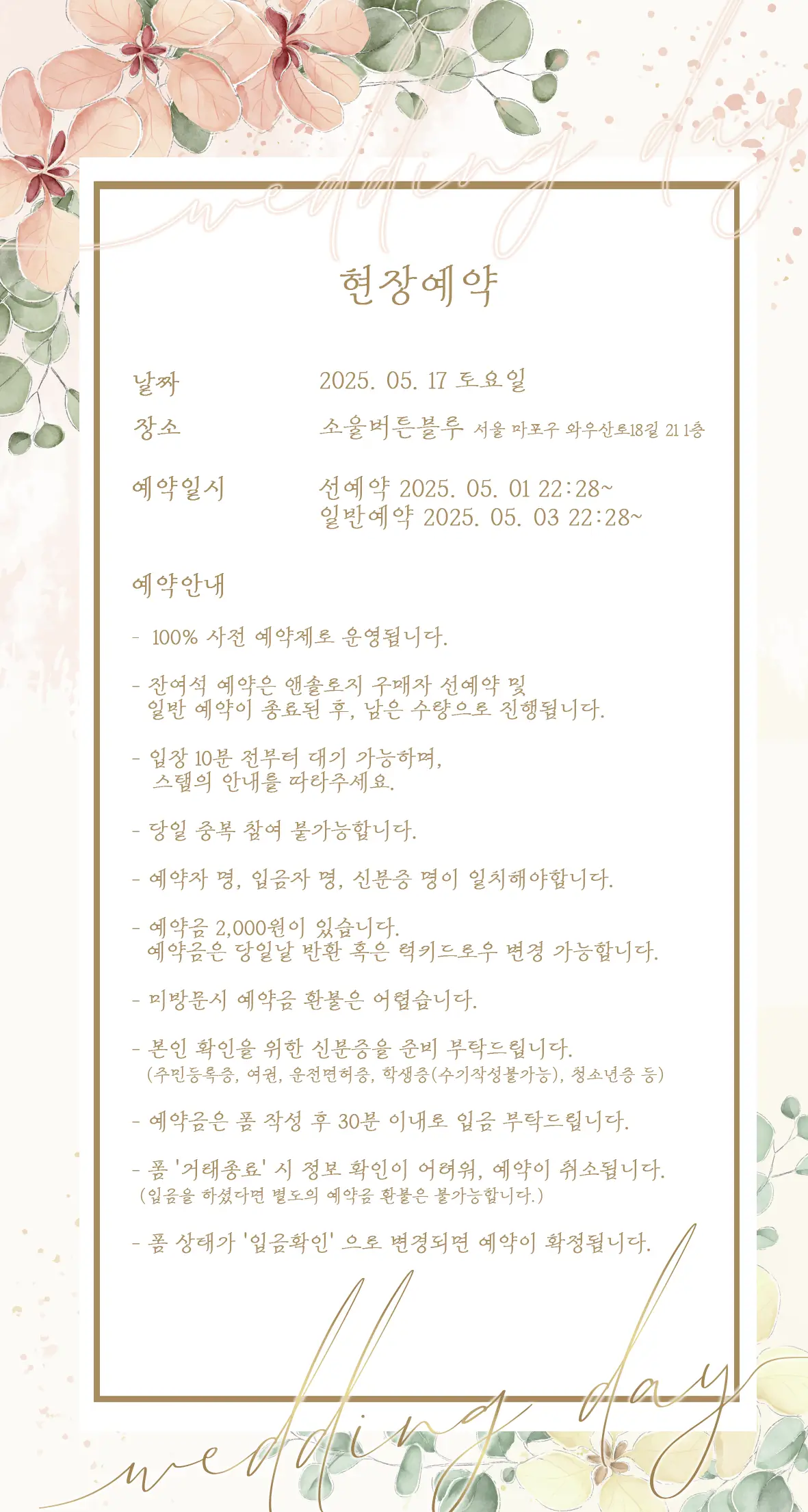 - 예약자 본인과 동반인 1명까지 입장 가능합니다.