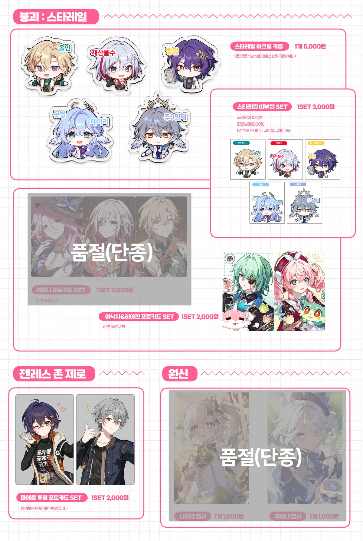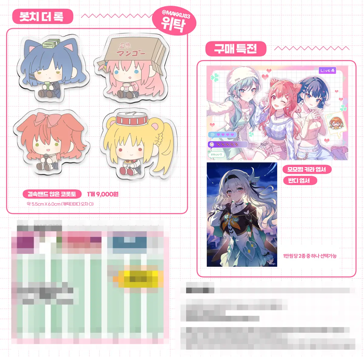 일부 아크릴류(코롯토)와 지류굿즈는 추가 발주가 불가능하여 재고수량이 정해져있습니다.