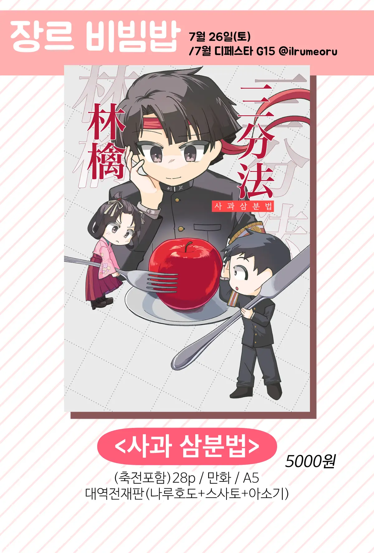 > 대역전재판 회지 <사과삼분법> 샘플페이지: https://posty.pe/1tu55b