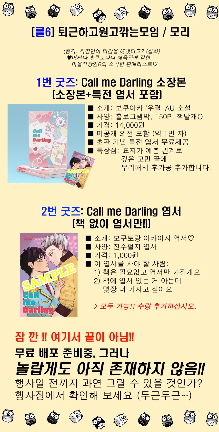 모리의 판매 굿즈 (콜미달링 신간, 특전 엽서_별도 판매) 선입금과 통판 폼입니다.