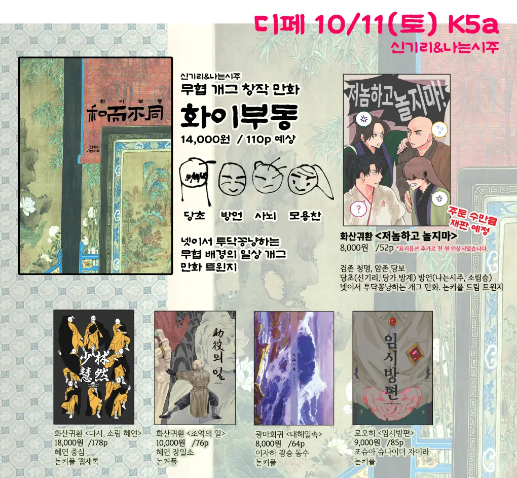 ___무협 창작신간<화이부동> 14,000원 (110p)/당초 방언 사뇌 모용찬 /넷이서 투닥거리는 무협 배경의 일상 개그 /*트위터에 올린 만화 일부가 약 10쪽 정도 포함됩니다. *화귀 관련 캐릭은 등장하지 않습니다. https://posty.pe/lp1nxe