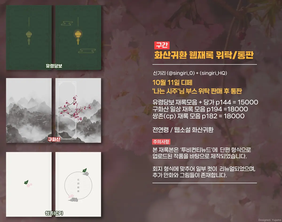 <유령당보> 15,000원 단편 5화 + 당가 1화 모음 (144p)<구화산> 18,000원 단편 8화 모음 (194p)<쌍존(cp)> 18,000원 단편 8화 모음 (182p) ※페이지 누락으로 인한 엽서 증정-> https://x.com/singiri_0/status/1916469132809408725