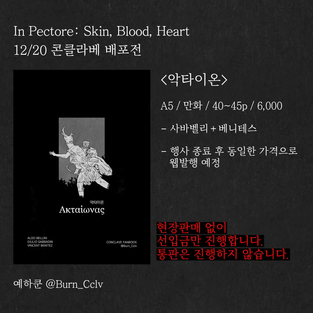 2025년 12월 20일 콘클라베 배포전 In Pectore: Skin, Blood, Heart에서 판매될 사바벨리+베니테스 회지 <악타이온> 선입금 판매입니다.