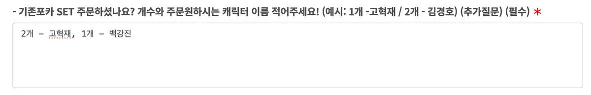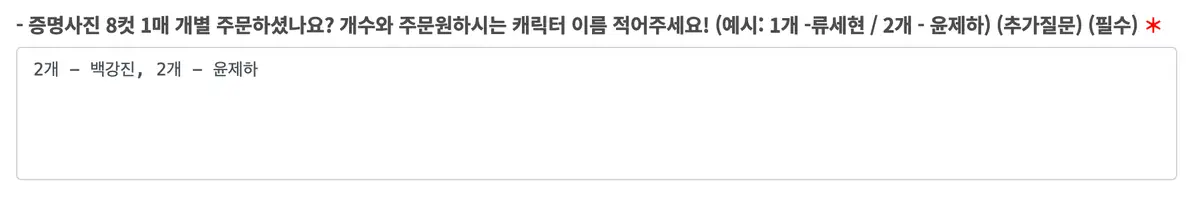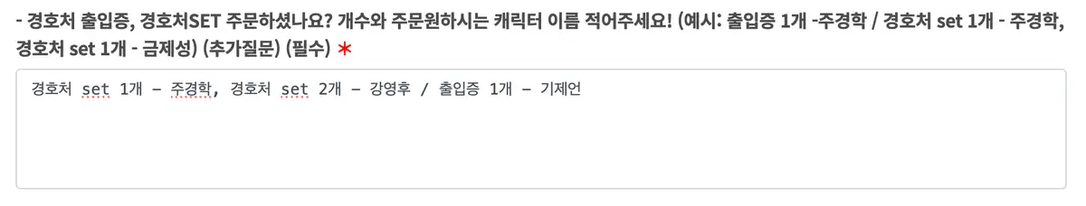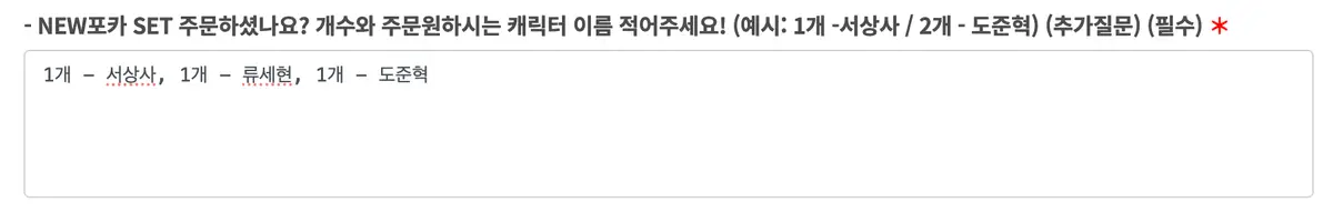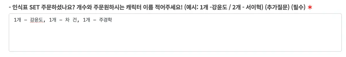 이후 주문을 진행하다 보면 나오는 아래 질문 칸에서 수량과 캐릭터 이름을 적어주세요 ❤️