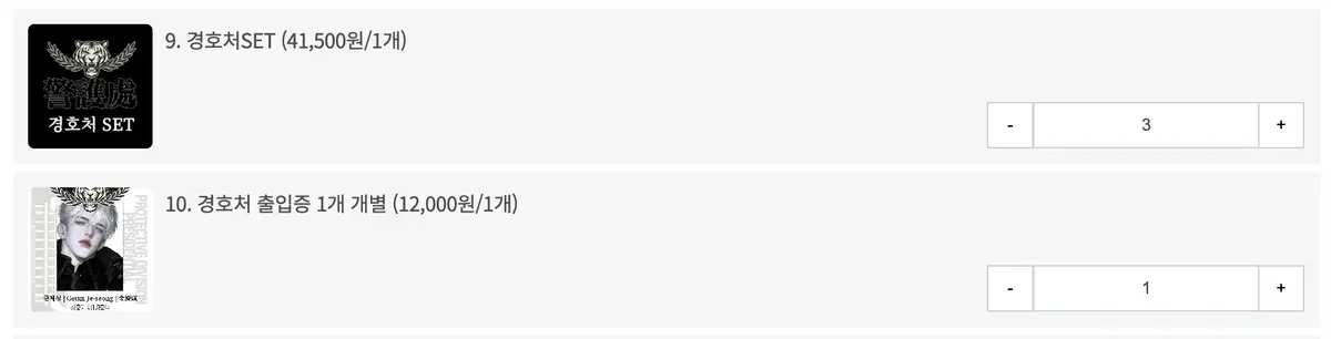 예시) 경호처set 3개, 경호처 출입증 1개 구매 시
