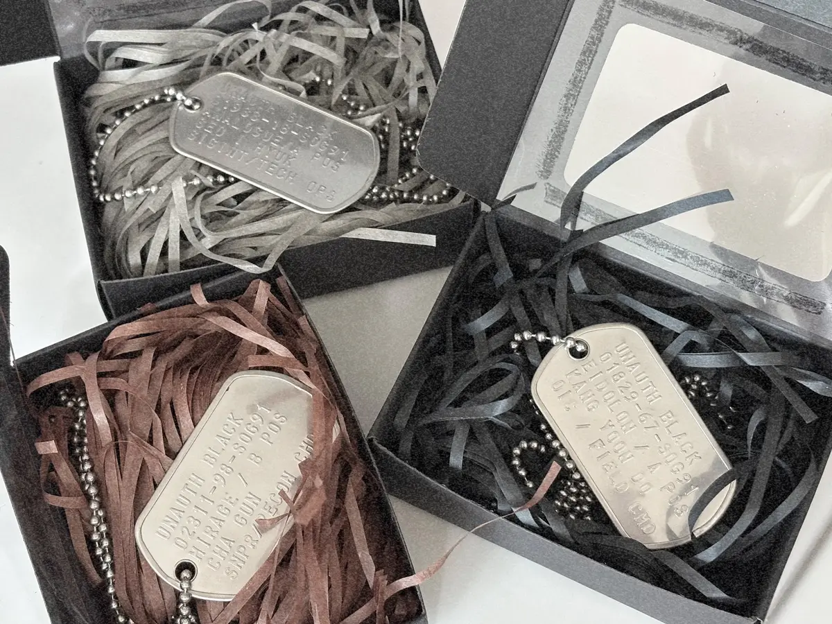 인식표 1개 + 양면 포토카드 3개 (미공개 에셋 포함) + 군번줄 (남성용 27인치, 여성용 24인치, 키링용 4인치 택 1)