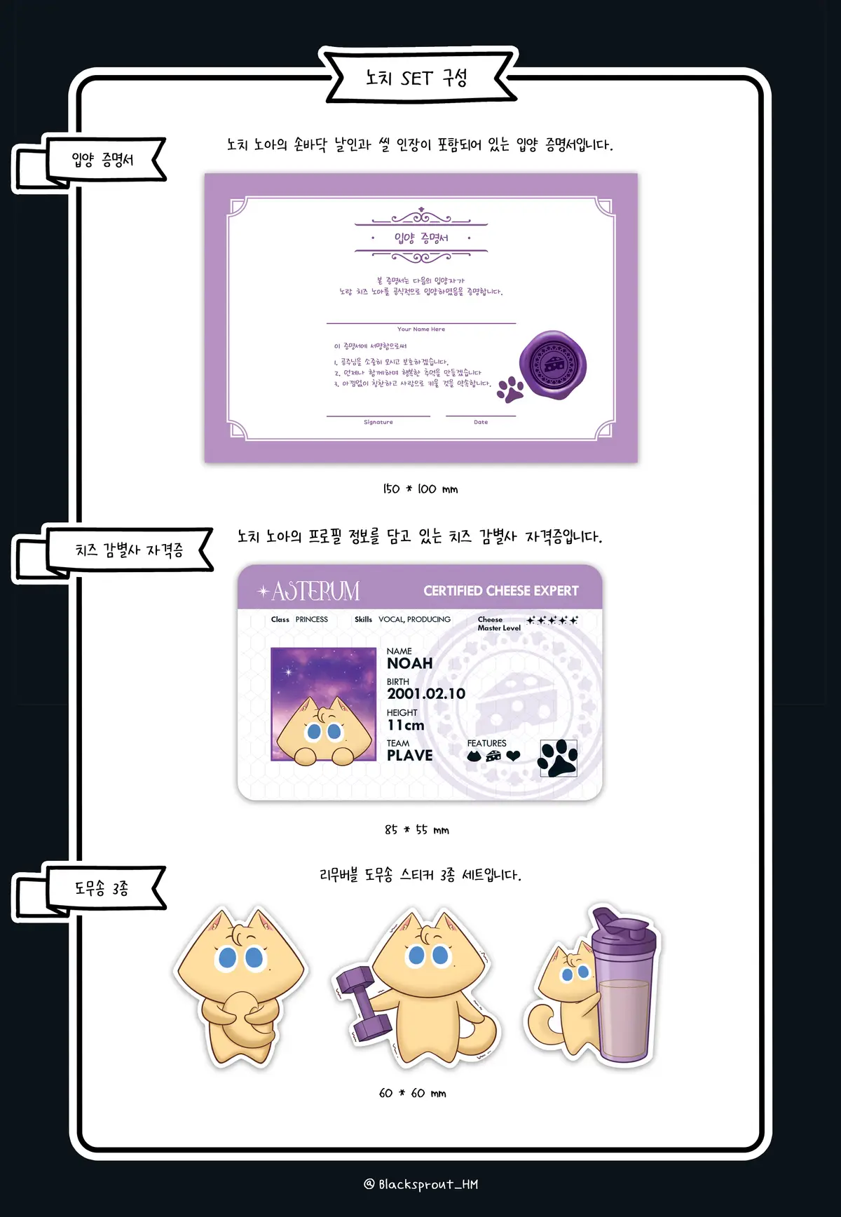 - 노치 노아: 노치 노아 + 입양 증명서 + 치즈 감별사 자격증 + 도무송 스티커 3종