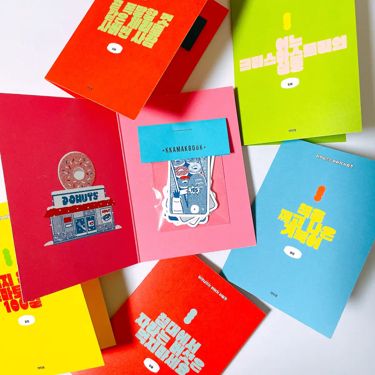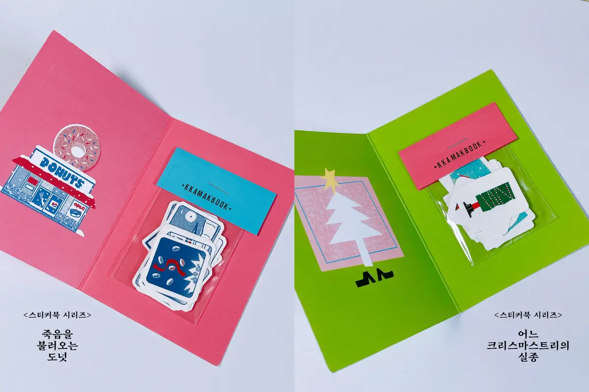 스티커북은 <터무니없는 이야기> 시리즈의 연장선으로 터무니없는 제목을 만든 뒤 한페이지 짜리 이야기를 만들었다. 한 페이지에 들어가는 모든 컷을 조각내어 스티커로 만든 다음 책처럼 포장하였다. 이야기의 주인공은 각 스티커북마다 다르게 설정되어 있으며 조각조각 나눠진 컷을 독자가 직접 맞추어 자신만의 이야기를 만들 수 있다.