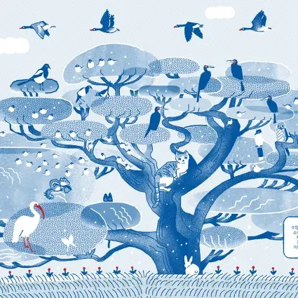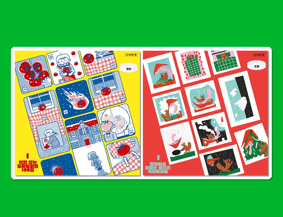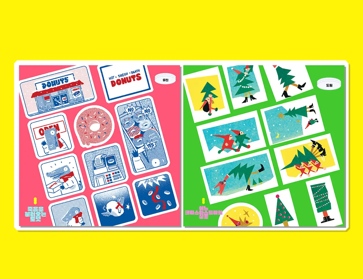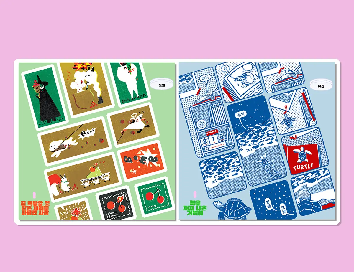 수제 도장을 찍어 만든 일러스트들을 디지털로 재구성했습니다.
