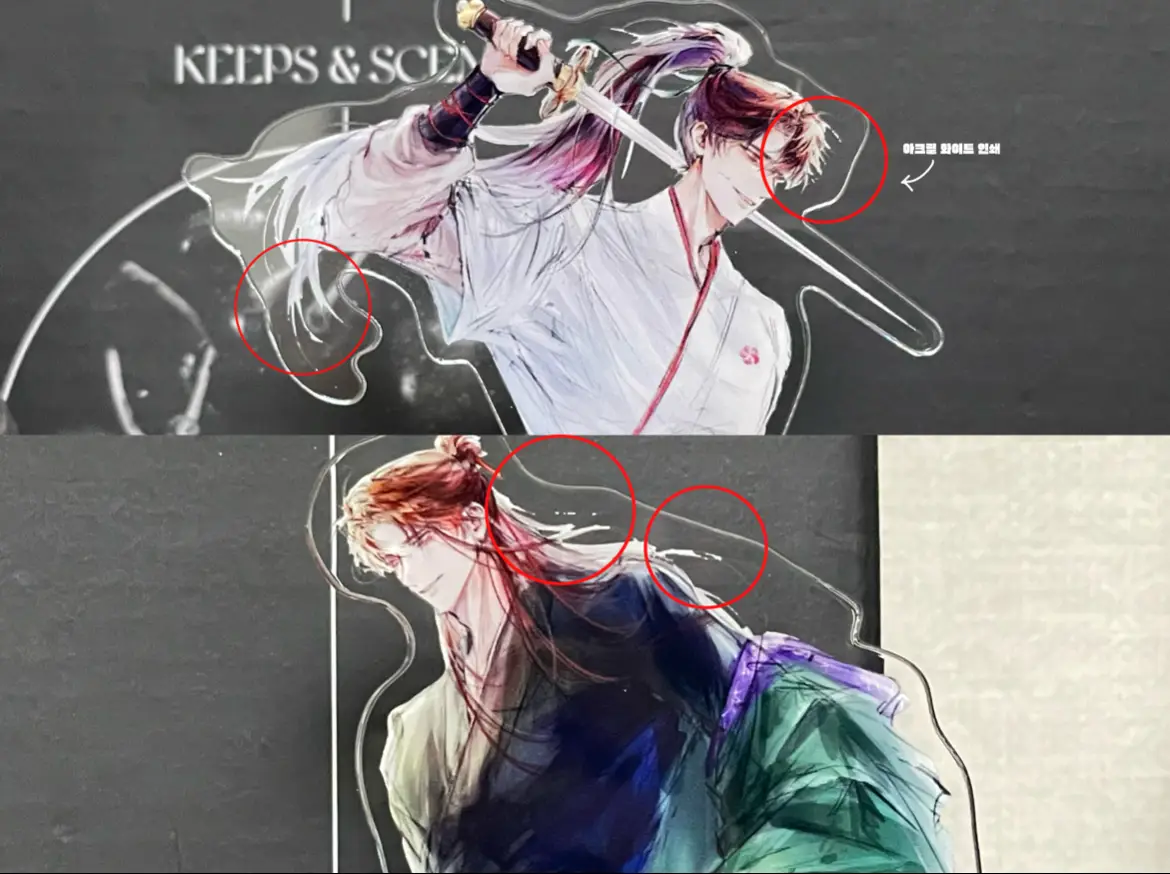 머리카락 부분으로 화이트 인쇄가 튀어나오거나 끊김 현상이 있습니다. 멀리서 보면 크게 티가 나진 않지만 구매하실 분들은 참고 부탁드립니다.