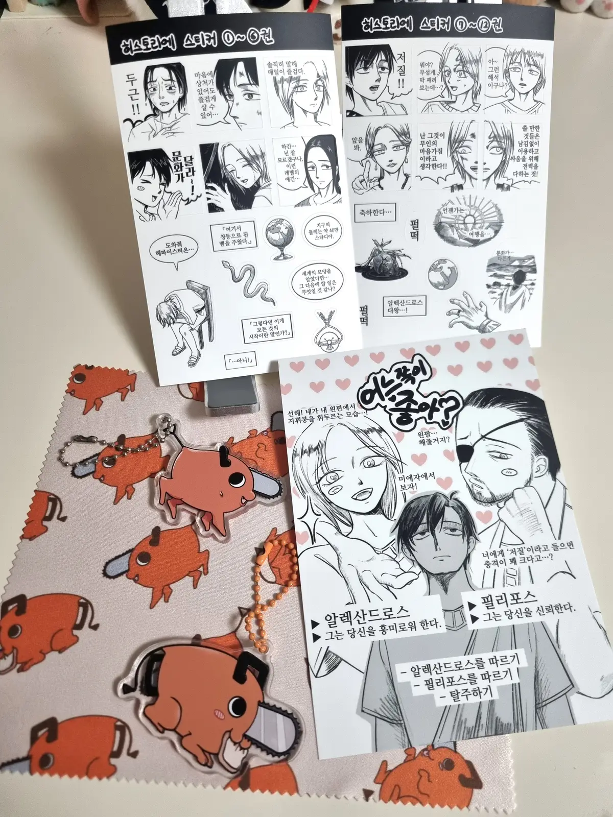 (히스토리에 스티커 및 엽서, 체인소맨 포치타 키링 및 안경닦이)