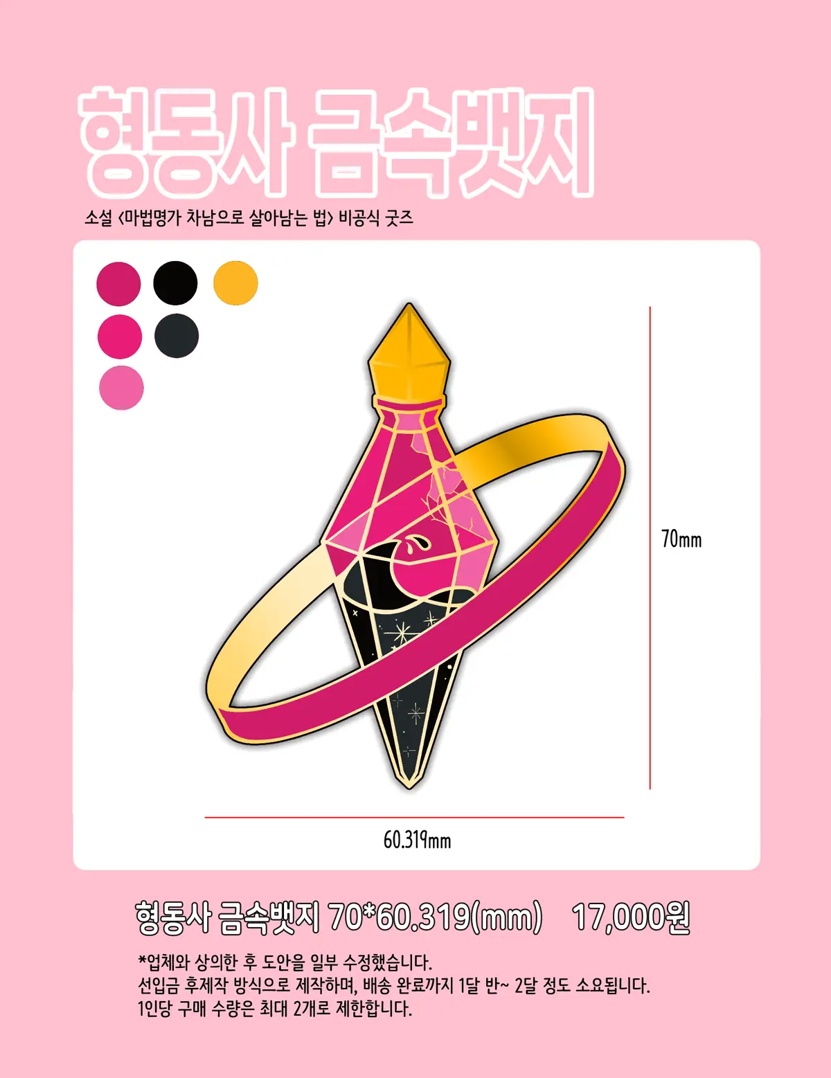 <마법명가 차남으로 살아남는 법>의 비공식 굿즈인 형동사 금속뱃지입니다.