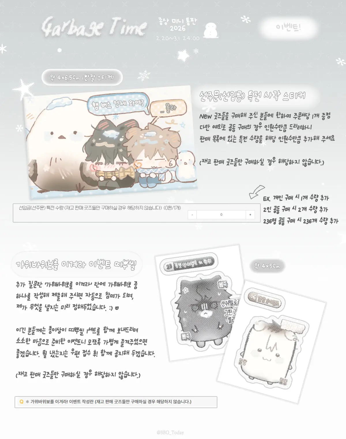 - 선주문(선입금) 특전은 New 굿즈들(신상)을 구매해 주신 분들에 한하여 주문서당 1개 증정. (※선입금 특전은 재고 판매 굿즈들만 구매하실 경우 해당하지 않습니다.) 판매 목록에 있는 '특전 수량' 물품의 수량을 필수적으로 기입해 주셔야 되며, 예외로 공동구매의 경우 인원수만큼 증정 드릴 예정이니 해당 수만큼 추가해 주세요. (Ex. 개인 구매 시 특전 수량 1개 / 2인 공동 구매 시 특전 수량 2개 입력)