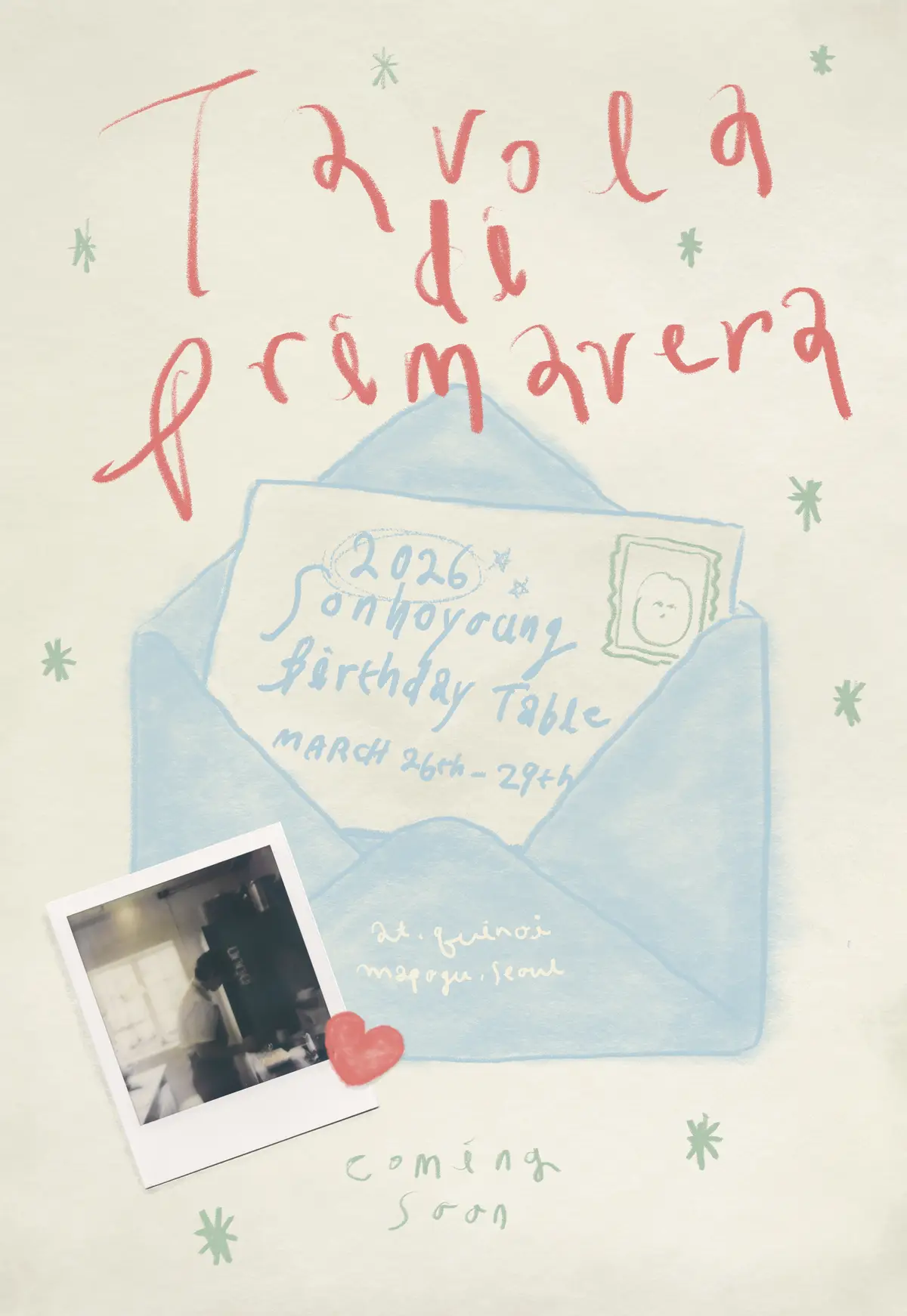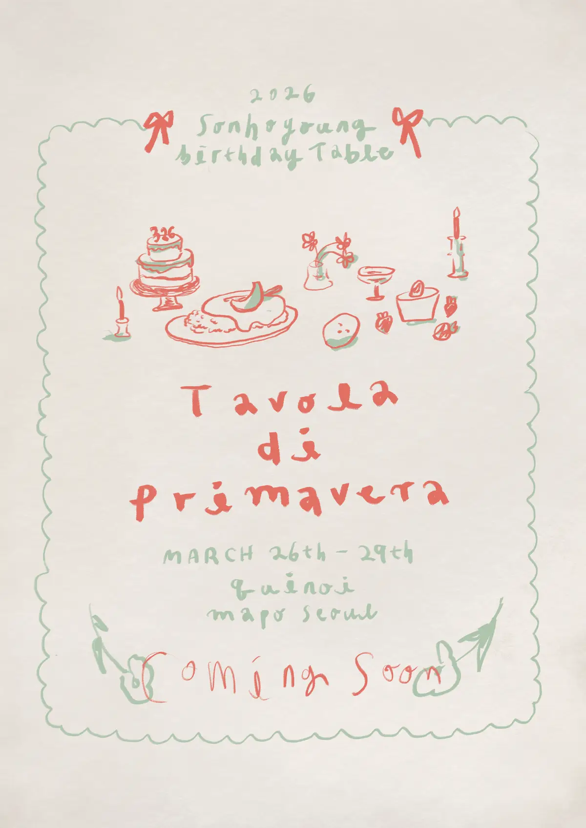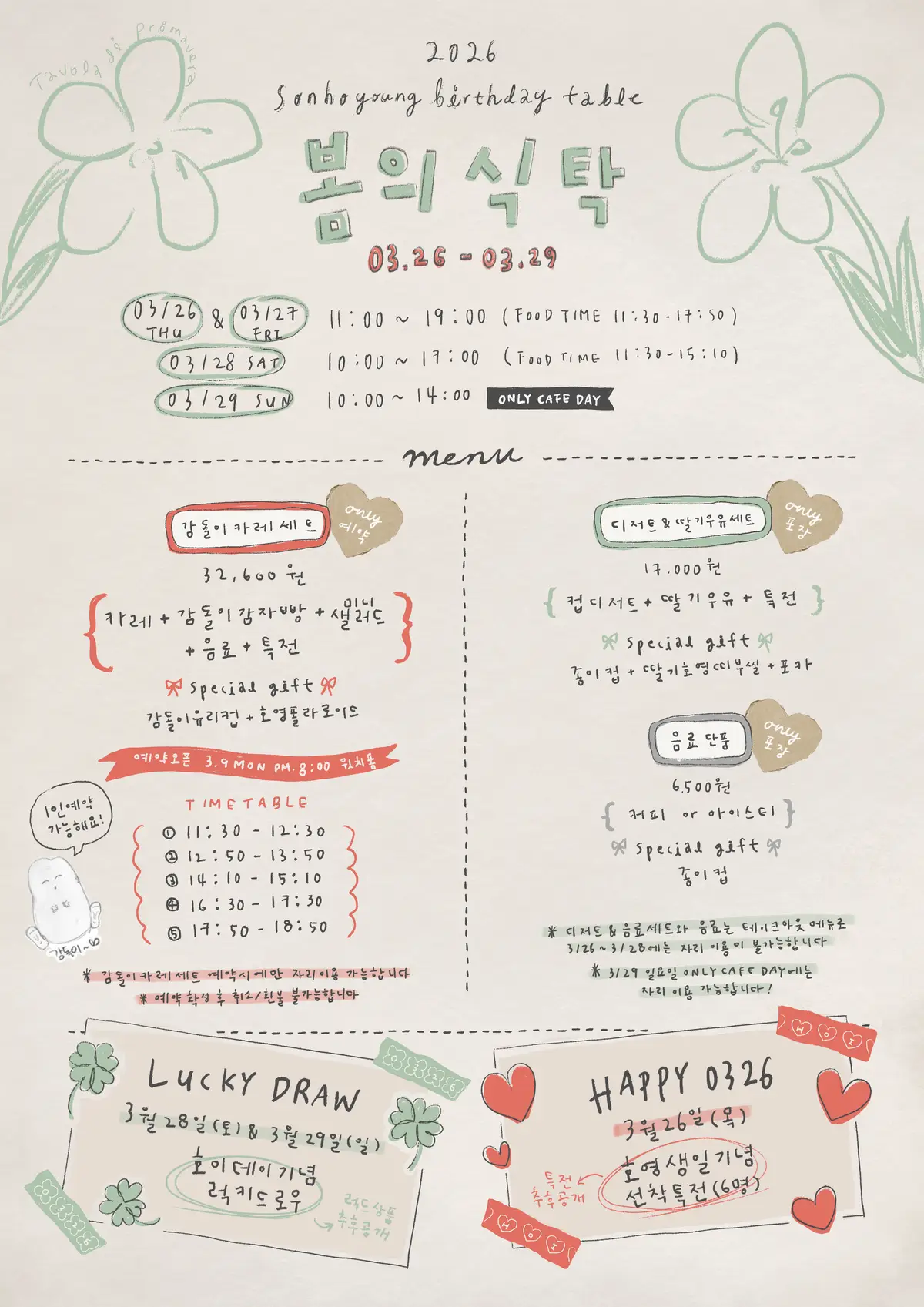 봄의식탁 2026 손호영 생일 카페 《 봄의 식탁 》 예약 폼입니다. - 일정: 2026.03.26 - 03.29 - 장소: 뀌노이(마포구, 서울)