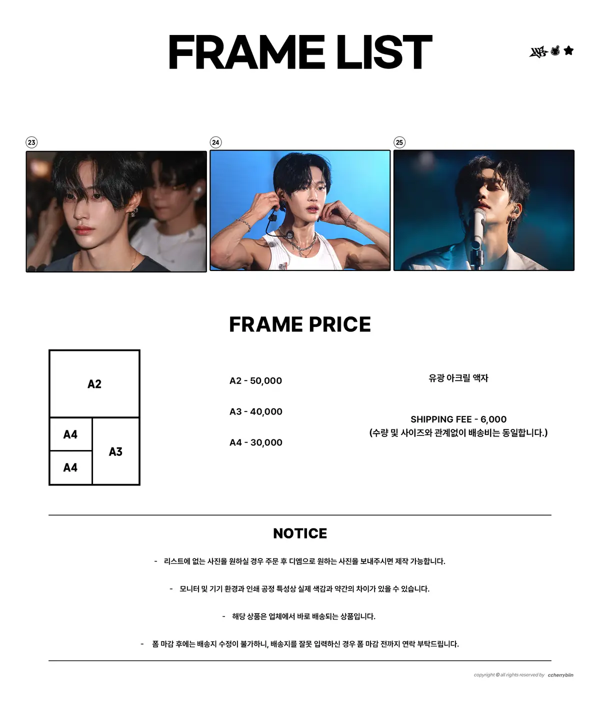 - 리스트에 없는 사진을 원하실 경우 주문 후 디엠으로 원하는 사진을 보내주시면 제작 가능합니다.