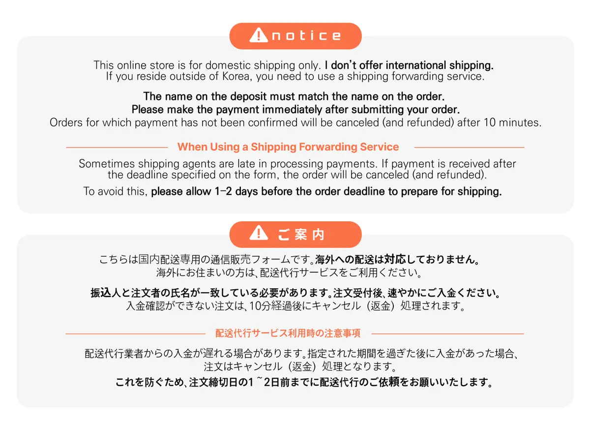 ✔️주문자와 입금자 성함은 동일하게 작성해주세요. / 폼 작성 후 10분 내로 입금해주세요. 시간 초과될 시 폼은 삭제됩니다.