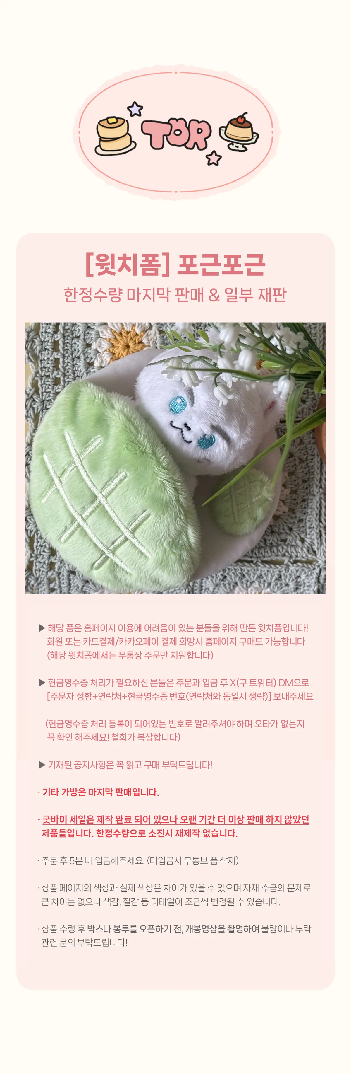 주문 후 1시간 내 입금해 주세요. 단, 1시간 안에 입금하셨음에도 제가 실시간으로 확인하지 못해 자동 취소되는 경우에는 최대한 빠르게 수동으로 복구 처리해 드립니다. 윗치폼의 경우에는 삭제 전 여러 차례 확인하고 처리하나 동명이인 등으로 확인이 잘못되는 경우가 있을 수 있습니다. 이 경우에는 주문서 재작성 후 X DM 으로 연락해주시면 바로 입금 확인 처리 하겠습니다. 미입금은 주문 의사 없음으로 간주되어 추후 재고 구매 제한이 있을 수 있습니다. 단, 주문서를 잘못 작성하신 경우 바로 DM으로 알려주시고 재주문하신 경우는 예외로 처리됩니다.