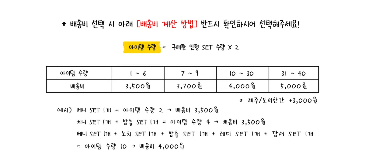 배송비는 구매하신 상품 갯수에 따라 아이템 수량 계산법 확인하시어 선택 부탁드립니다.