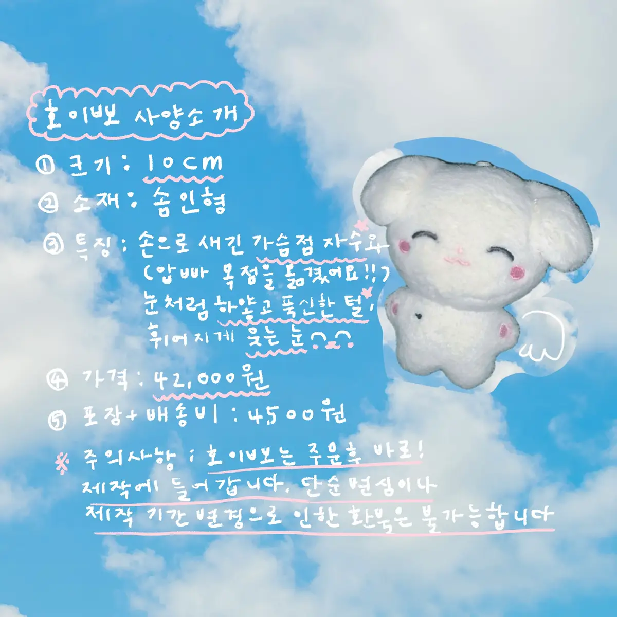 ( 원래 2-3개월로 공지되어있는 업체의 제작기간을 - 공장 공정과 수작업을 동시에 진행하는걸로 욕심내서 부탁드렸답니다. 제작 기간이 늦어진다고 호이뽀를 파양하시면 안돼요... 기간 변경 인한 환불은 절대 불가능 한점 꼭꼭 확인해주세요 ! )