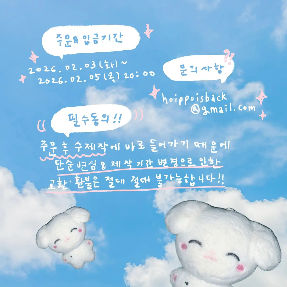 단순 변심이나 제작 기간 변경으로 인한 환불은 불가능합니다.ପ( ॑꒳ ॑)っ