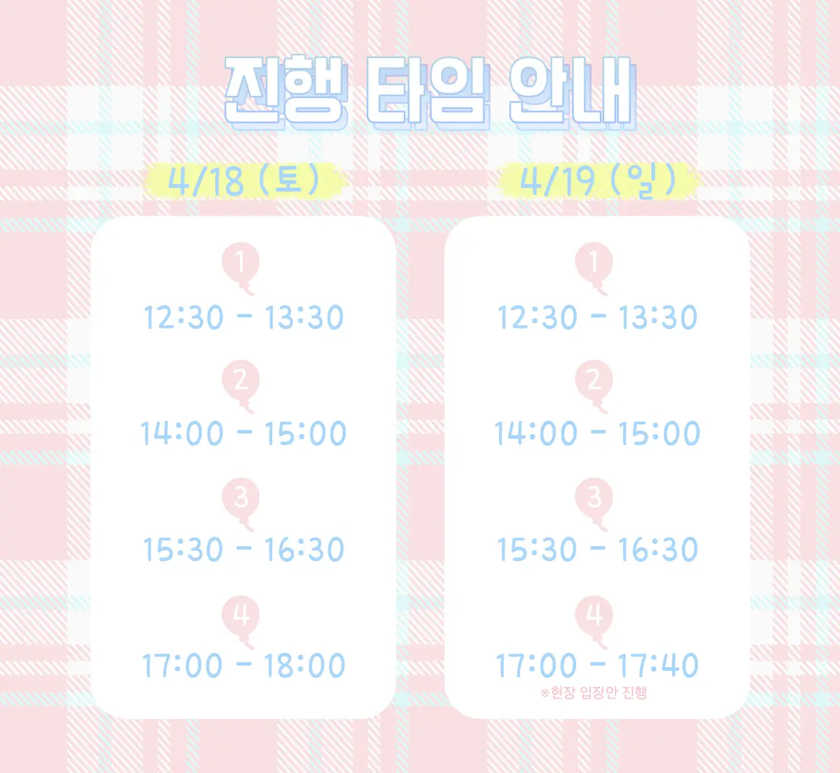 - 각 타임마다 1시간 행사 진행 후 30분간 재정비 시간이 있습니다.