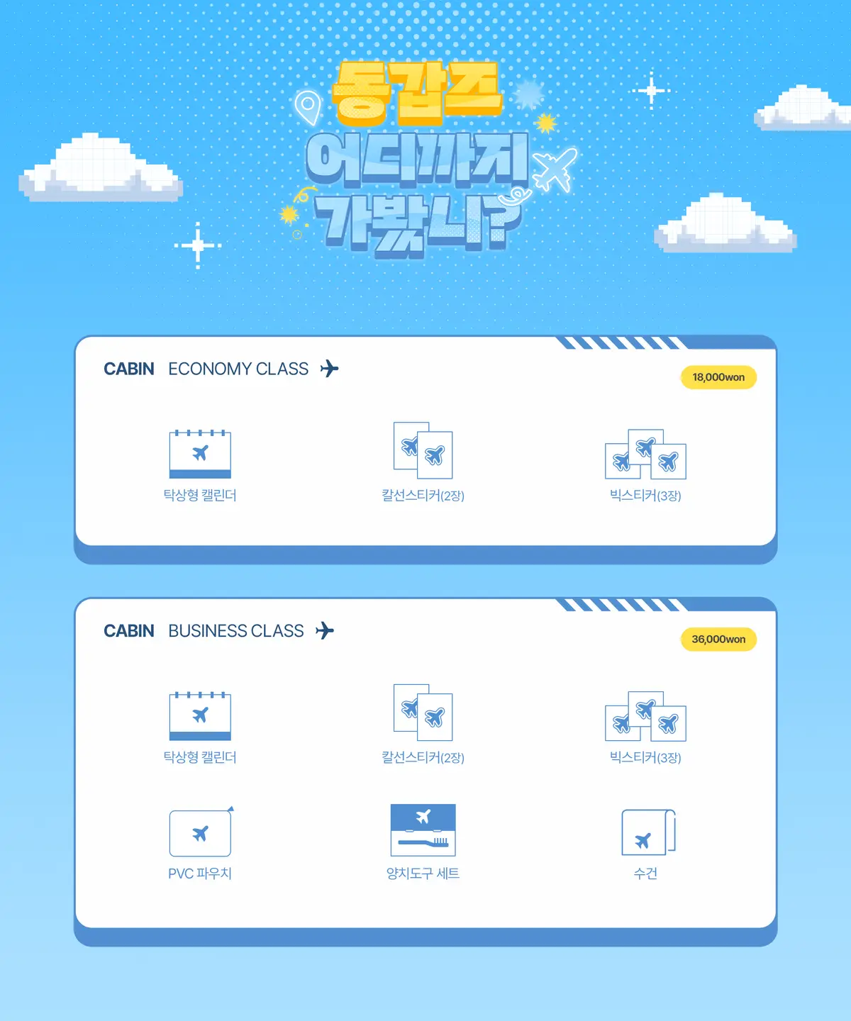 - 달력 패키지는 이코노미 클래스, 비즈니스 클래스 각각 1인 2세트 구매제한이 있습니다.