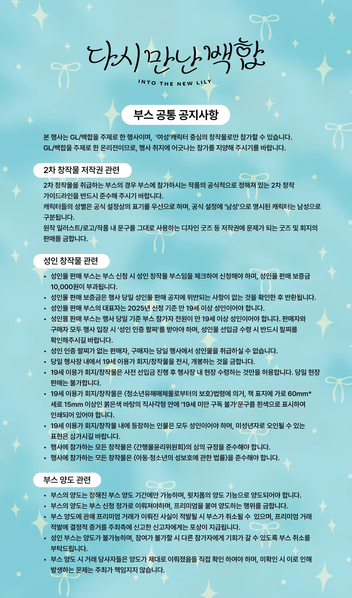 - 양도 기간 외에는 부스 양도가 불가하며, 주최진과 사전 협의 없이 신청 계정주명을 변경하면 본인 확인이 불가능하여 입장 거절될 수 있습니다.