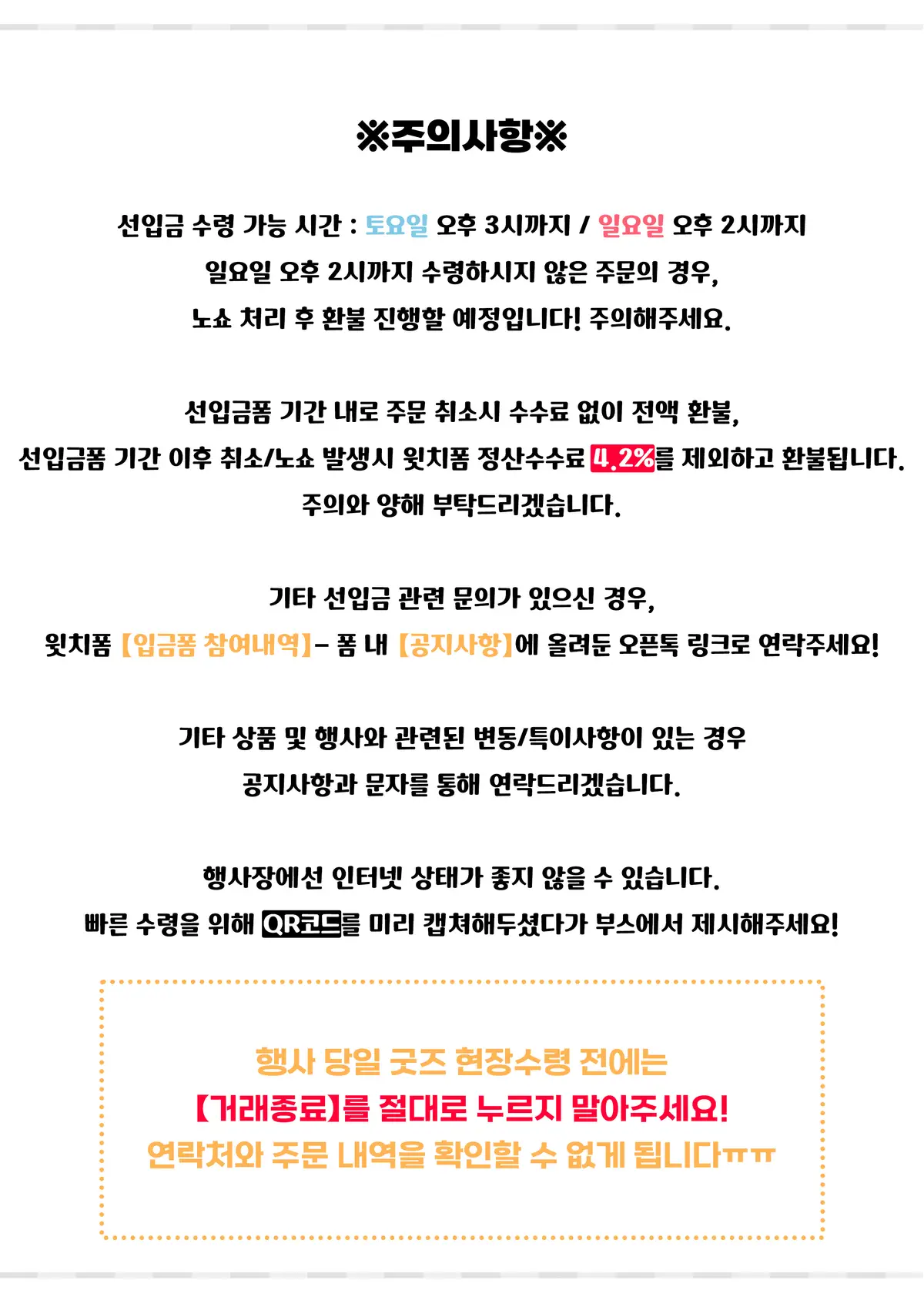 선입폼 기간 이내 요청하시는 주문취소, 또는 현장에서 수령 과정에 발생한 저희 과실의 굿즈 누락의 경우엔 전액 환불,