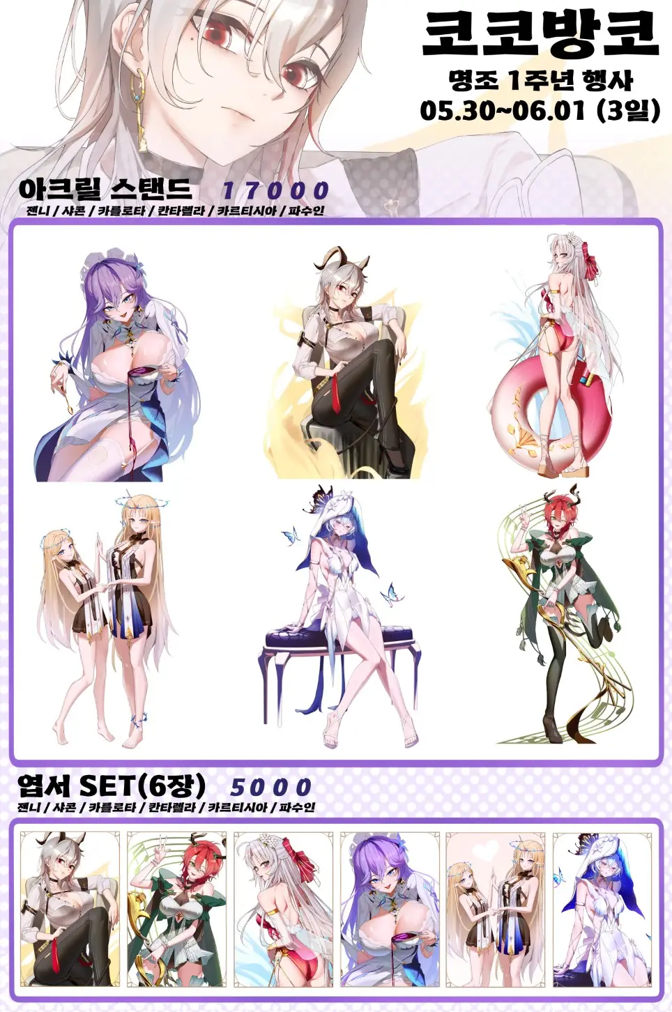 아크릴 구입시 해당 캐릭터 대형엽서 같이 드립니다.