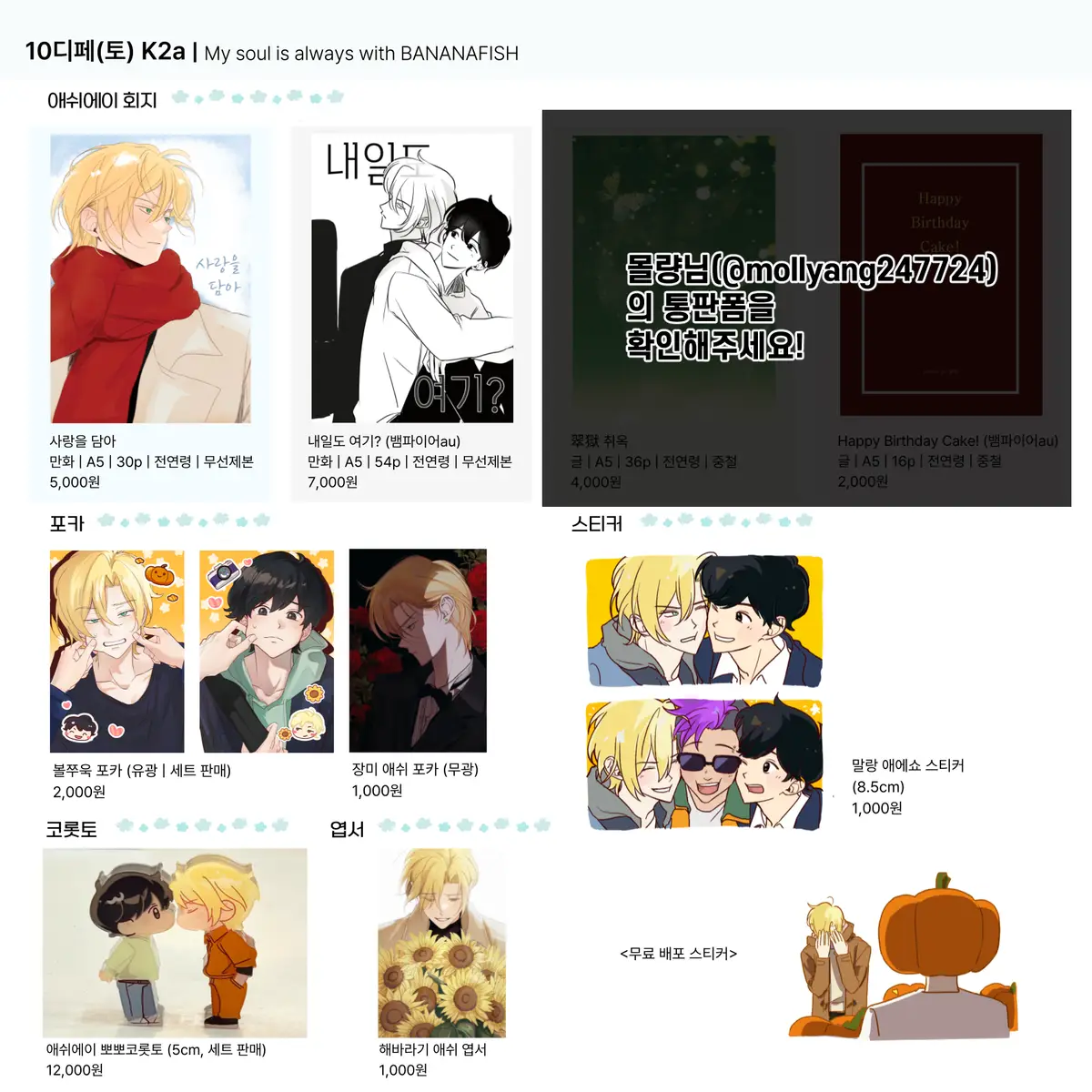 현장에서 매진되었던 회지 두 권 / 해바라기 애쉬 엽서 / 볼쭈욱 포카만 수량에 맞춰 새로 발주할 예정이며, 나머지 굿즈들은 재고 판매합니다.