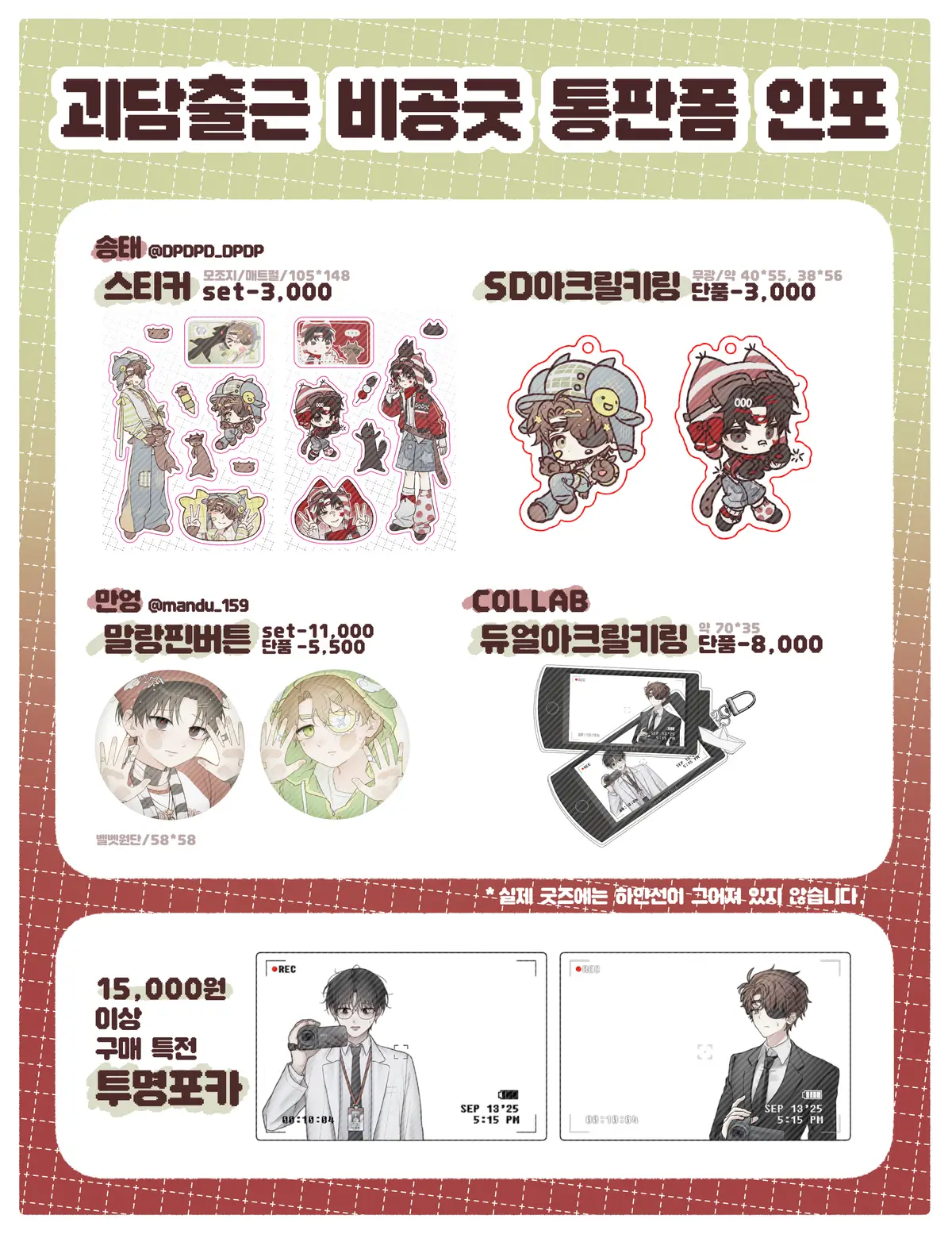 해당 굿즈들은 전부 선주문 후제작 상품입니다! 주문종료 후 배송접수까지 약 한달~ 한달 반 정도가 소요될 수 있습니다. 이 점 유의하시어 구매를 부탁드립니다.
