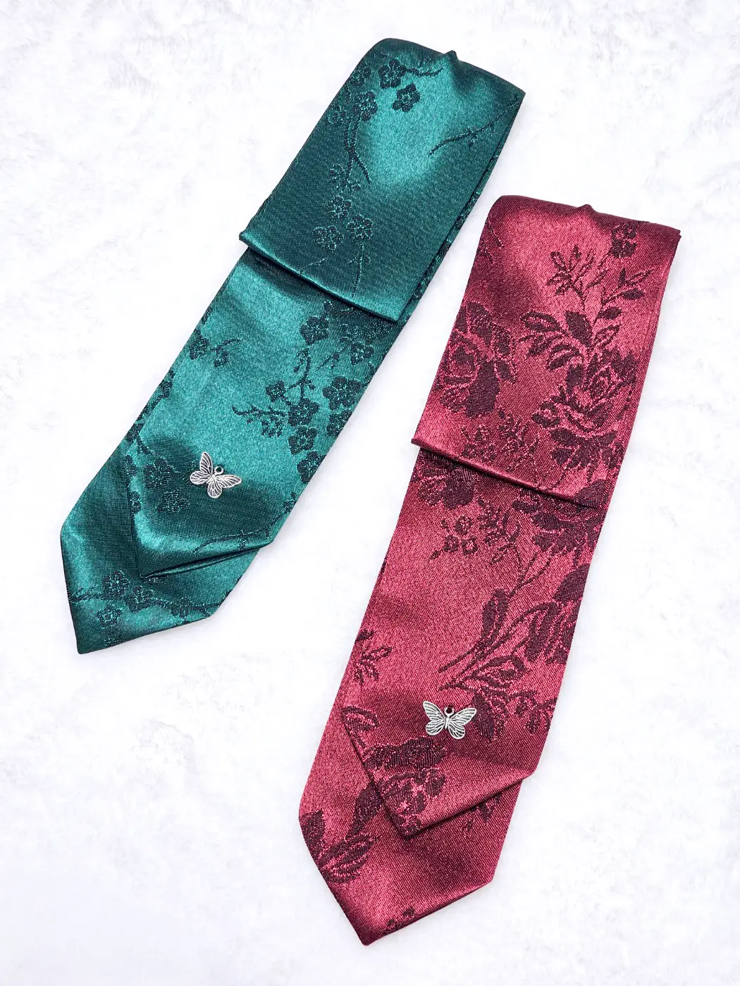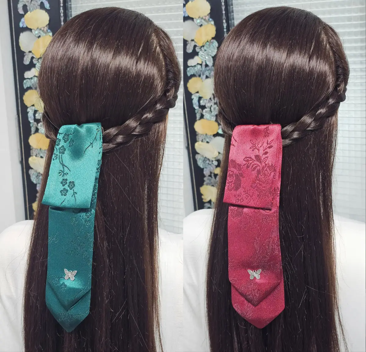 <나비 댕기 머리핀> 사이즈 약 6cm x 23cm 매화녹색은 매화무늬 장미홍색은 장미무늬가 있습니다. 꽃에 나비가 앉았다는 스토리텔링으로 색상도 차분하여 고급스럽고 우아합니다. 댕기착용이 불편하거나 탈착이 어렵다고 느끼시는 분들을 위해 머리핀을 달아 착용이 쉽도록 제작하였습니다. 머리를 고무줄로 묶으신 후 그 위에 핀을 집어 고정하시면 됩니다 핀을 접착하는데 공예용강력글루건을 사용하고 있어 가끔 조금 튀어나오거나 묻을 때가 있습니다. 이는 하자가 아니오니 예민하신 분께서는 구매를 피해주세요 |