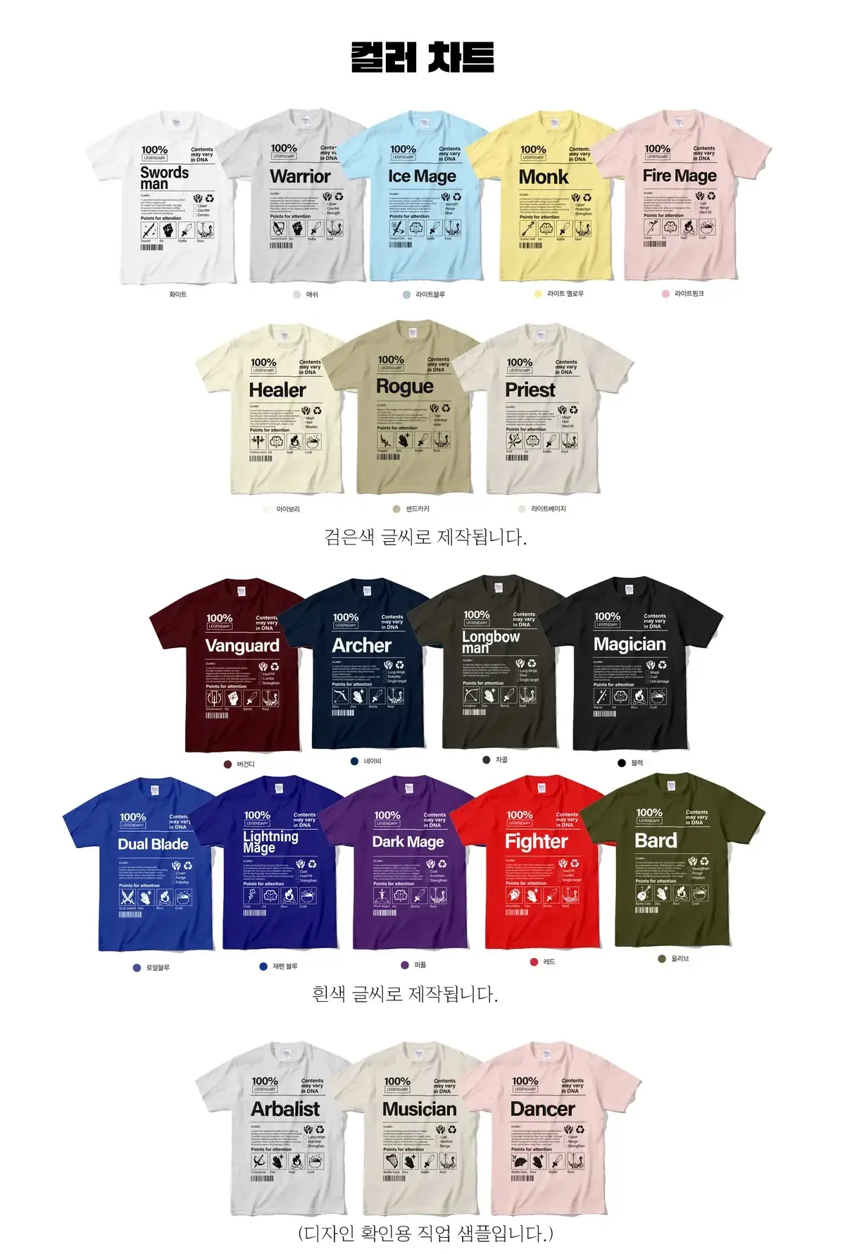 어두운 티셔츠: 블랙, 차콜, 버건디, 네이비, 로얄블루, 재팬블루, 퍼플, 레드, 올리브