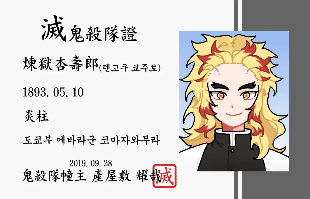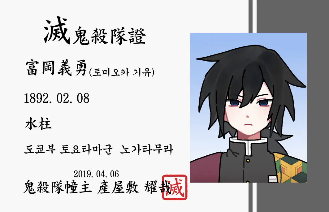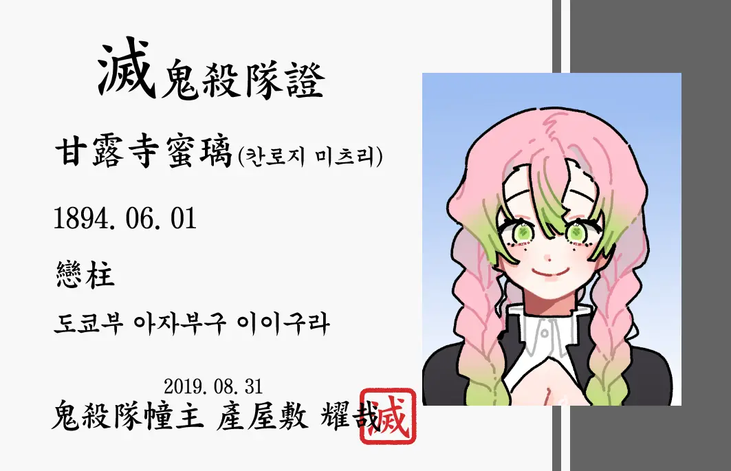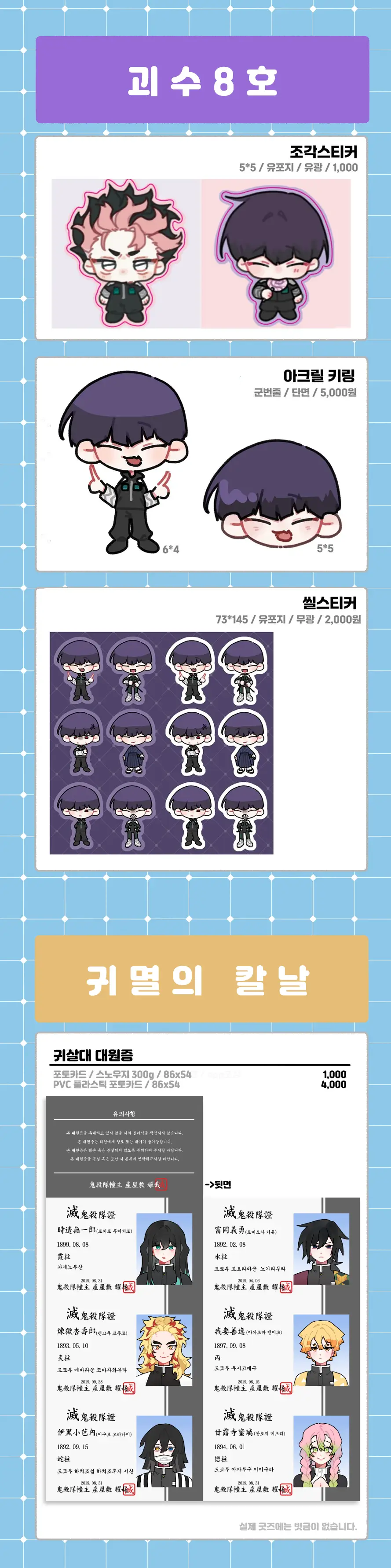 대원증의 경우 PVC 플라스틱 카드를 원하시는 경우 대원증(토미오카 기유) 1,000원을 클릭 후 pcv카드 3,000원을 원하시는 대원증 수량만큼 추가하여 구매해주시길 바랍니다.