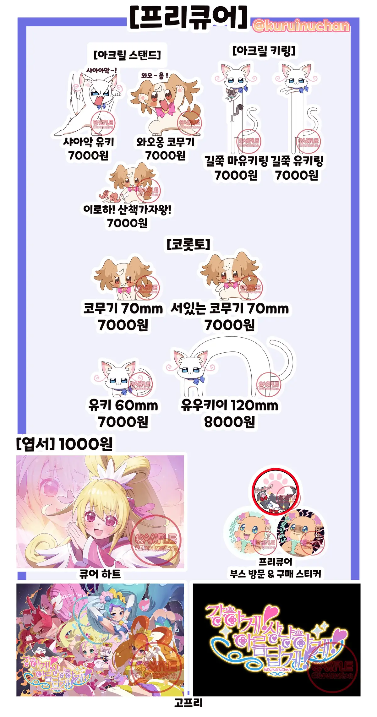- 프리큐어 굿즈를 구입하신 분들에게는 선착순으로 '고프리의 미스 샤무르'와 '마호프리의 모후룬' 스티커를 같이 보내드립니다. (스티커가 모두 소진될 시 받지 못하시는 분들이 계실 수도 있기 때문에 미리 양해 부탁드립니다.)