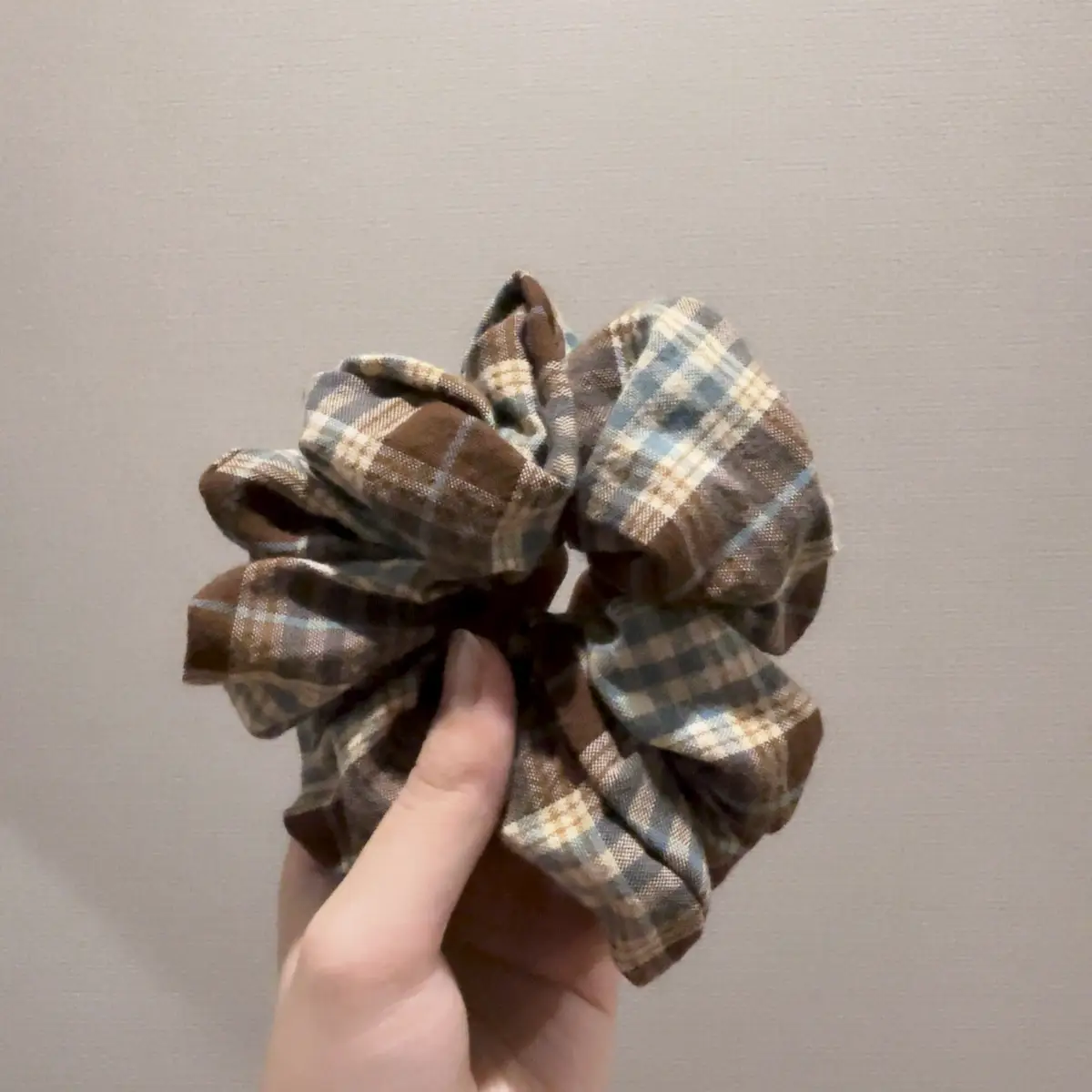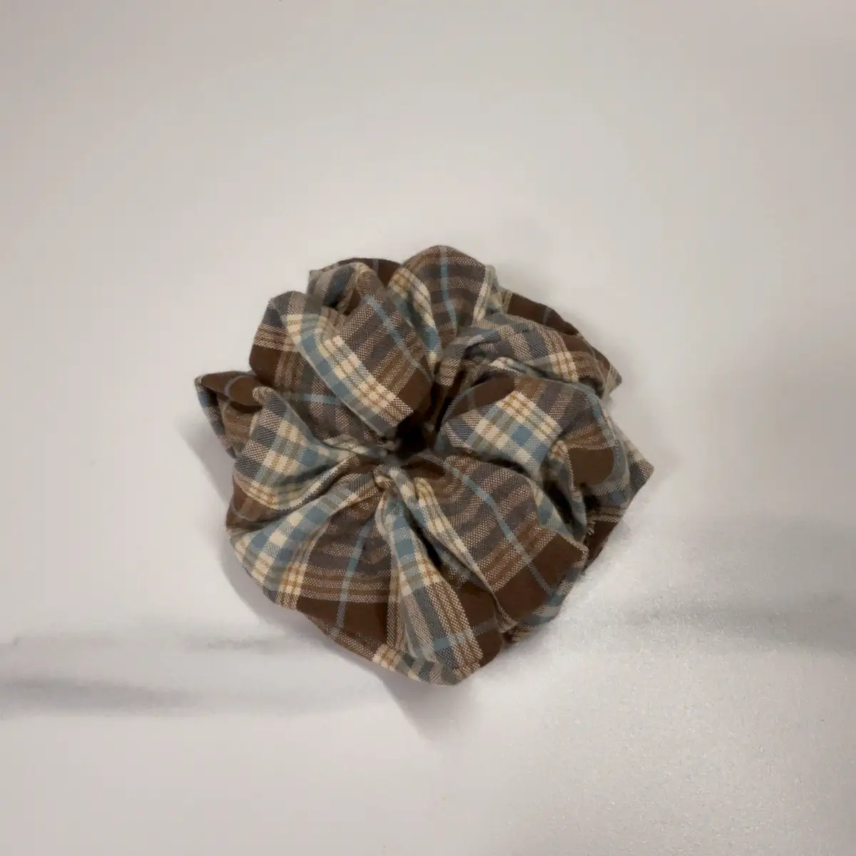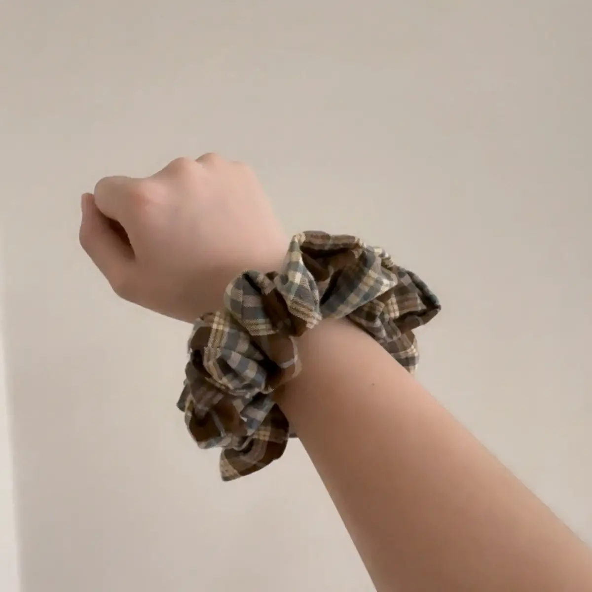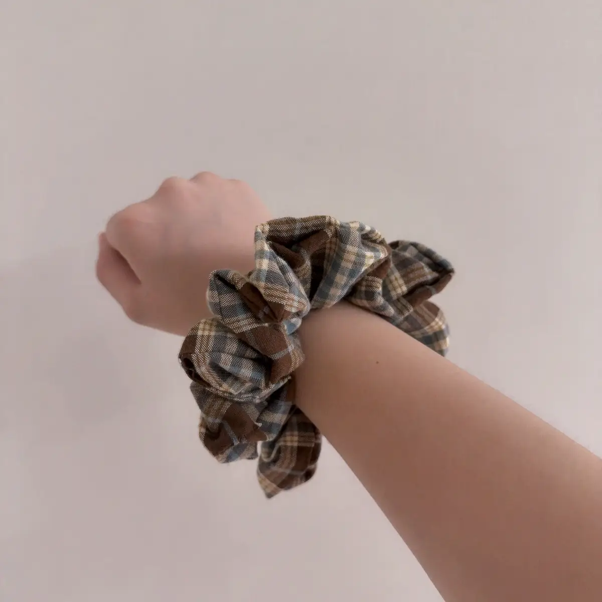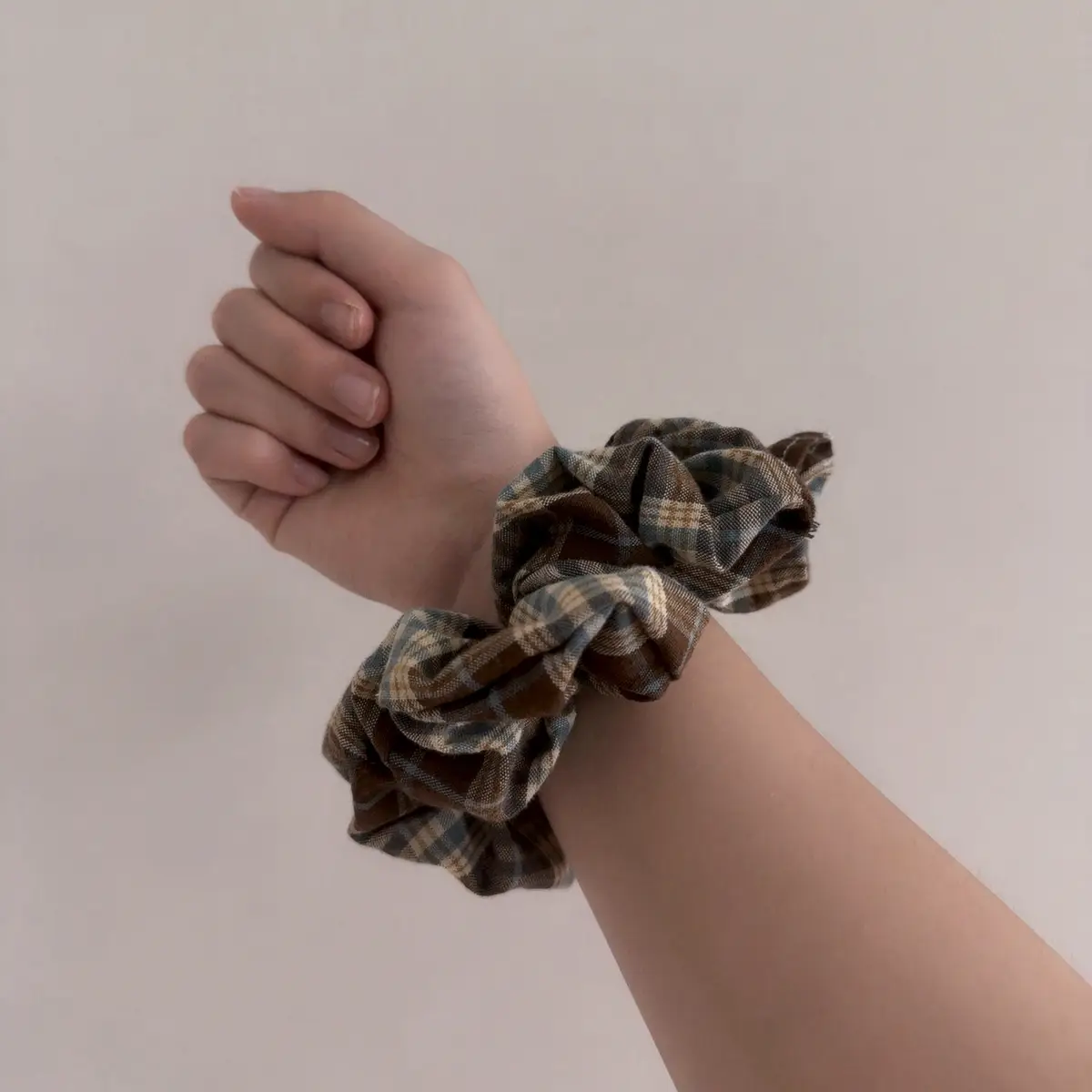바닐라 무드 가득한 민트 초코 색상의 체크 원단으로 만든 스크런치!