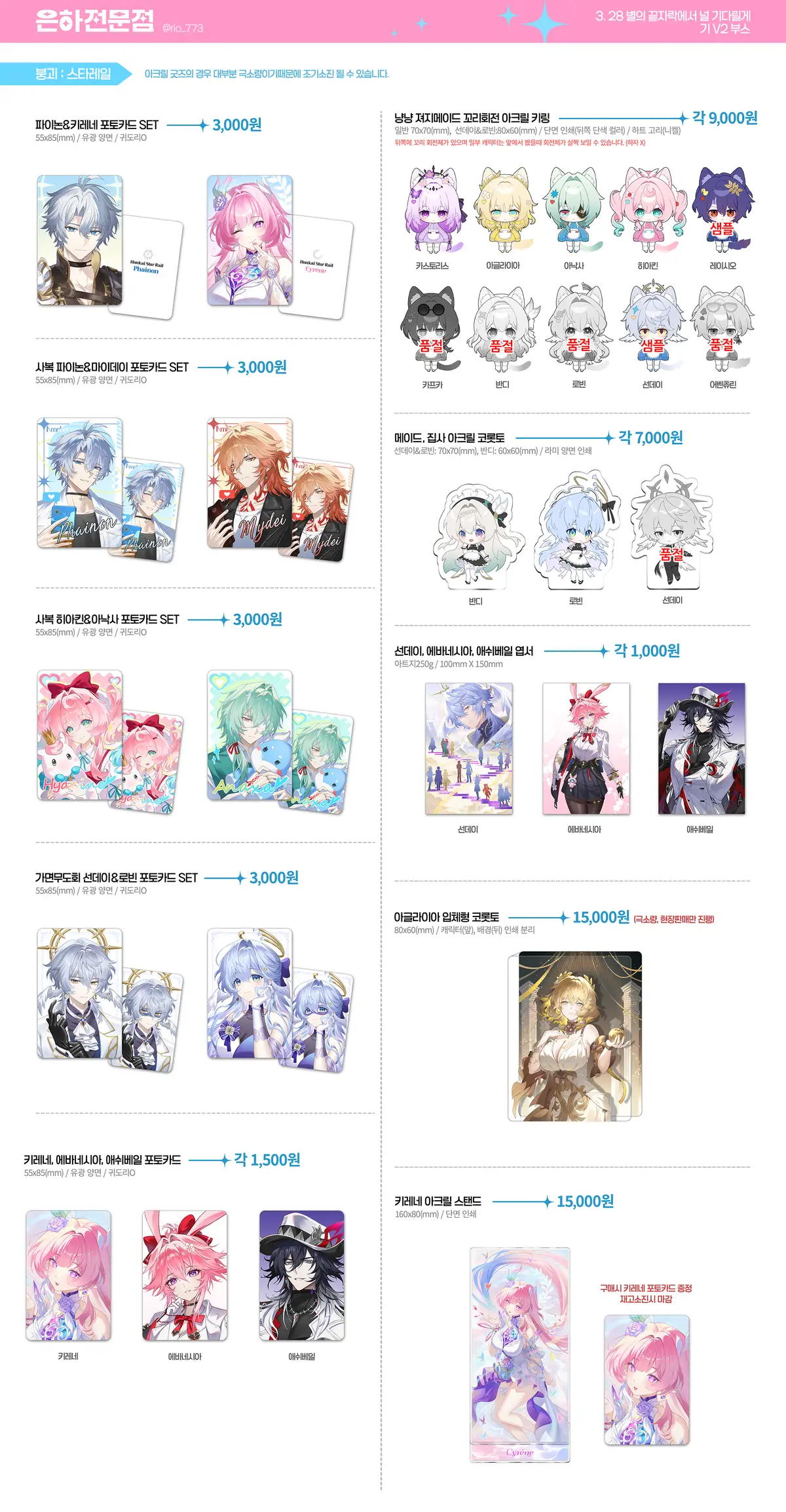 아크릴류는 모두 극소량(10개이하)이기때문에 샘플용(필름X) 구매란이 따로 있으므로 참고 부탁드립니다.