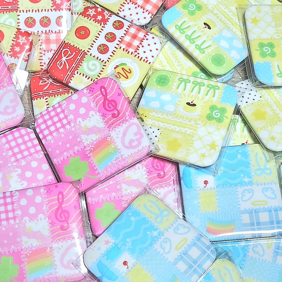 144. 분홍 패치워크 사각 핀버튼 (약파본) (37*37/무광)