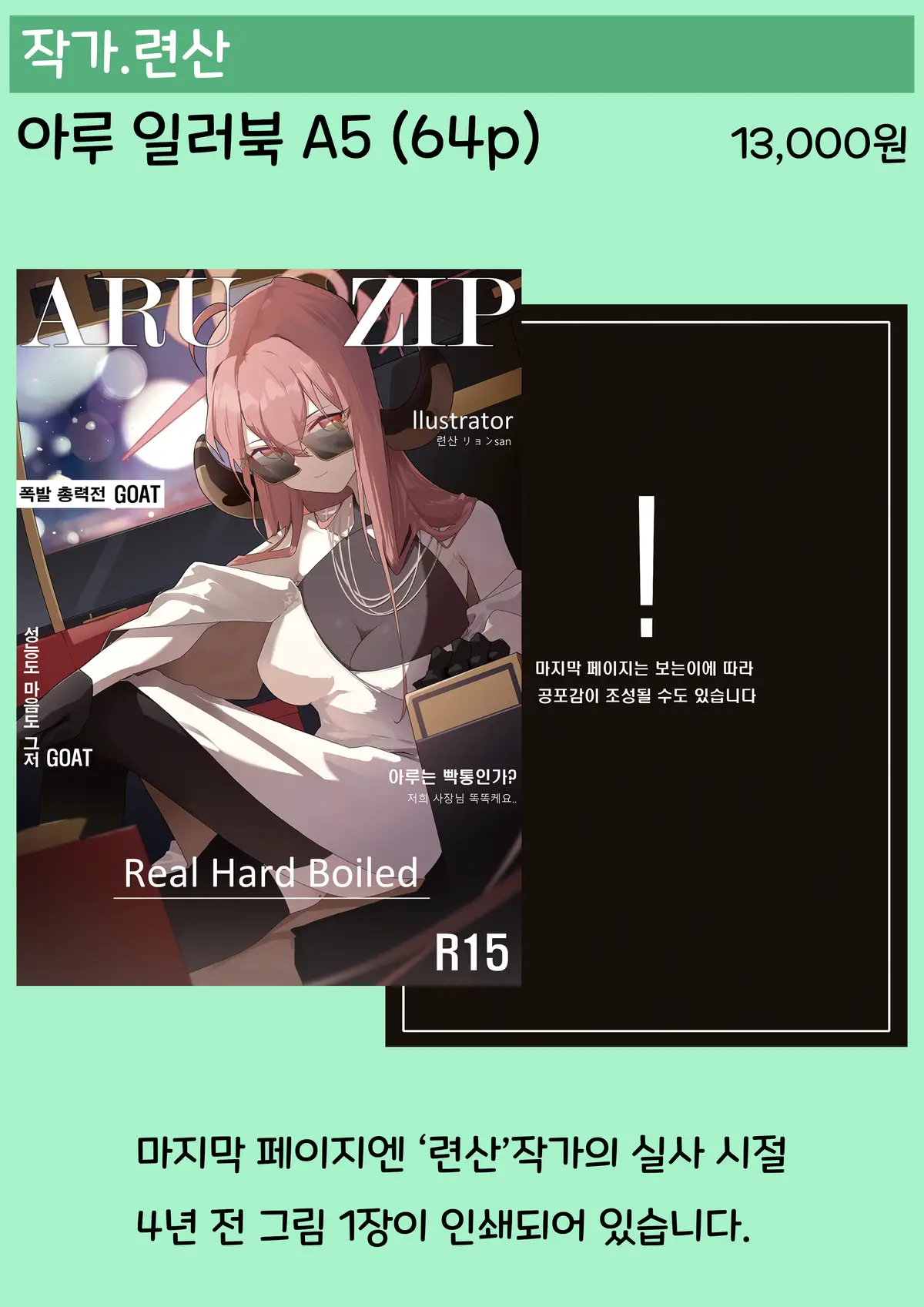 아루 일러북의 마지막 페이지에는 '련산'작가님의 4~5년 전 그림 1장이 인쇄되어있습니다.