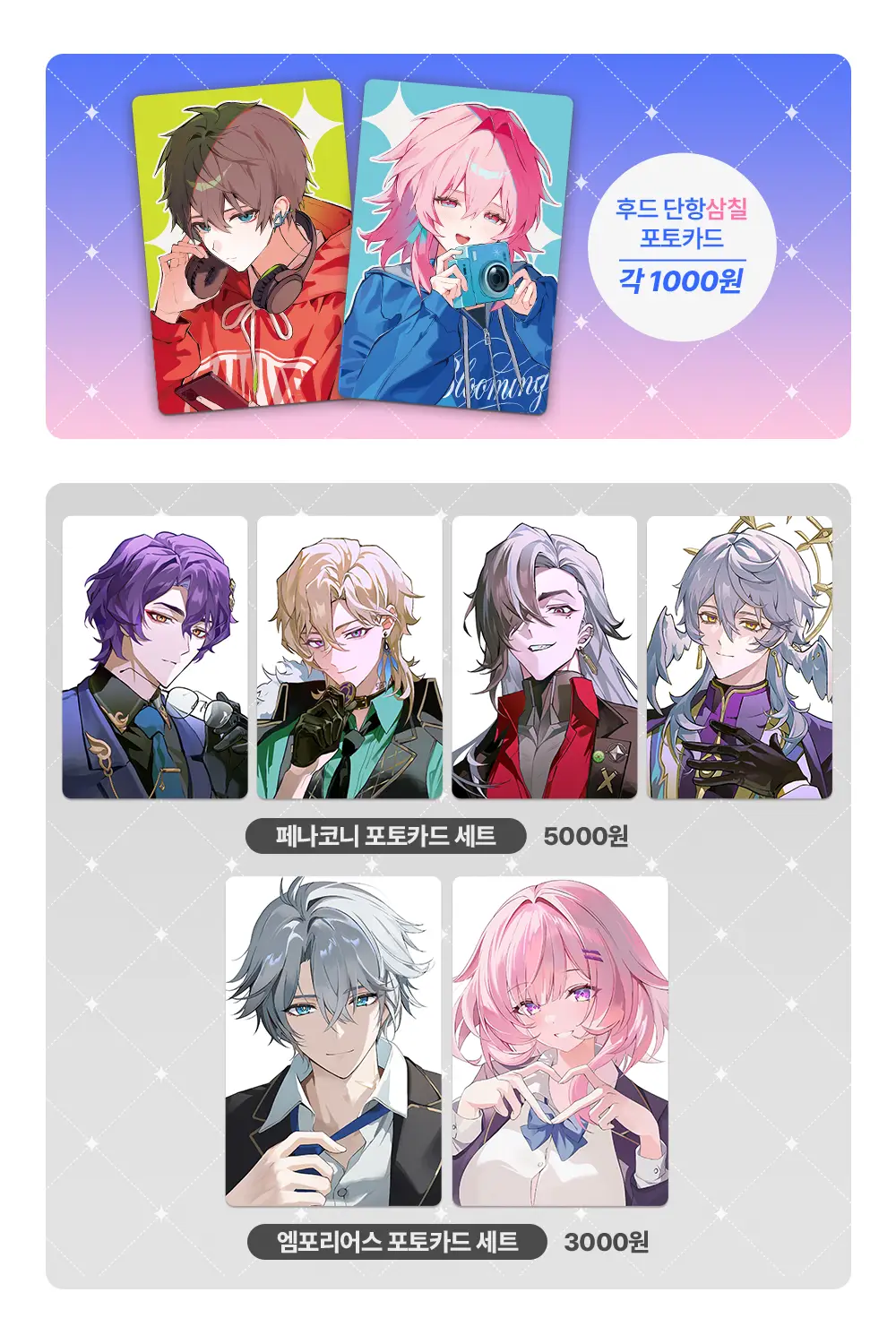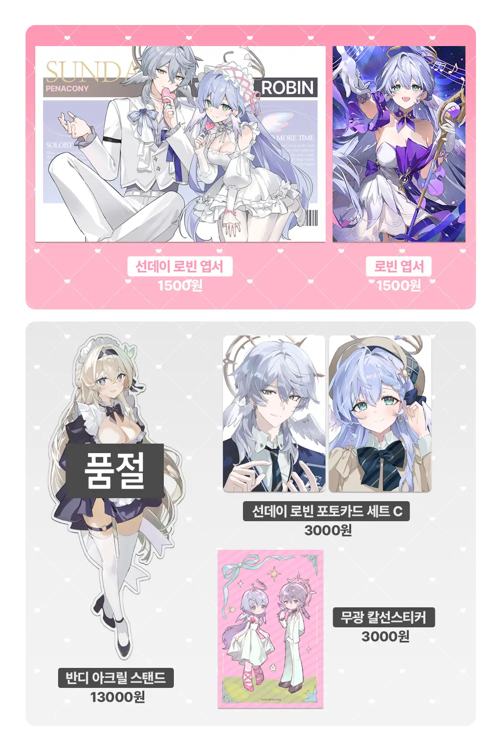선데이로빈 신상(포토카드AB, 엽서, 아크릴), 후드 단항삼칠(아크릴, 포토카드)를 제외한 굿즈의 경우 재고 판매로, 재고 소진시 품절처리 됩니다.